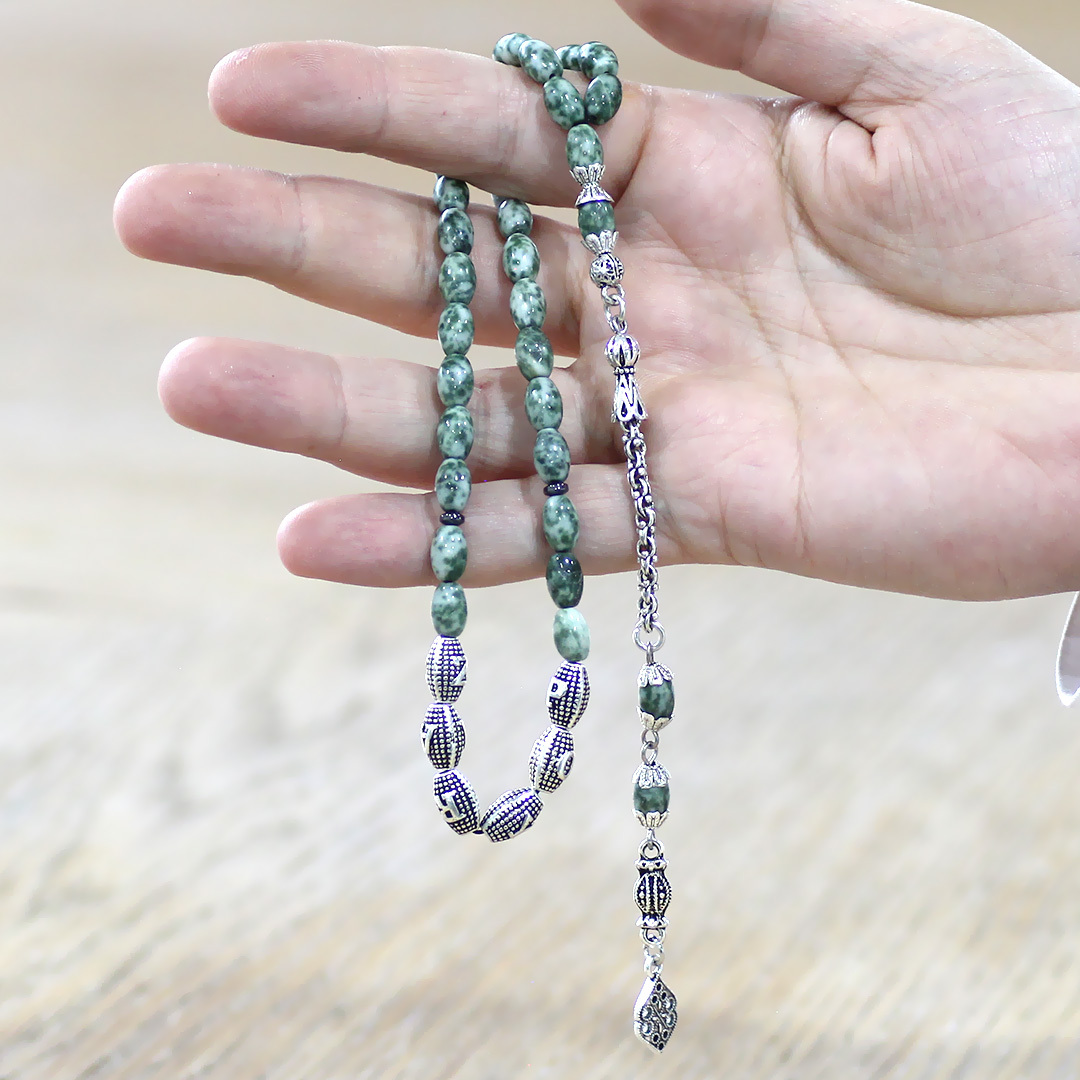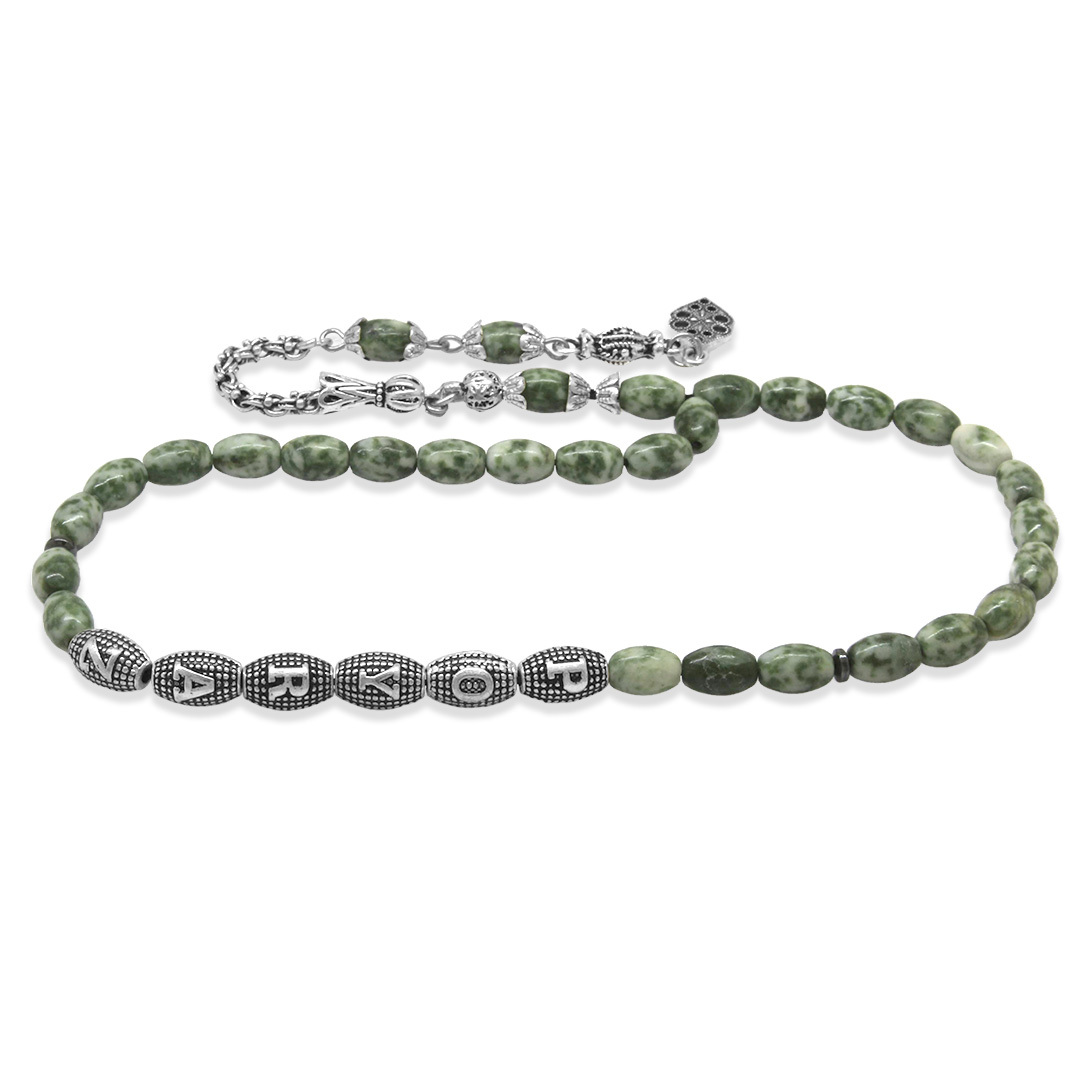Doğaltaş Jasper Tesbih - Kararmaz Metal Arnavut Püsküllü - Kişiye Özel İsim Yazılı - Arpa Kesim