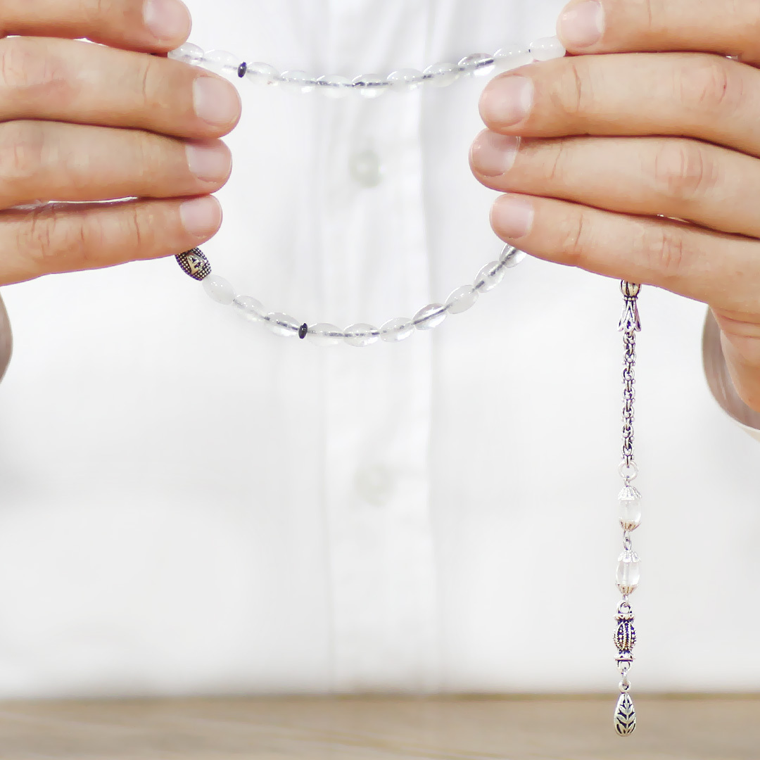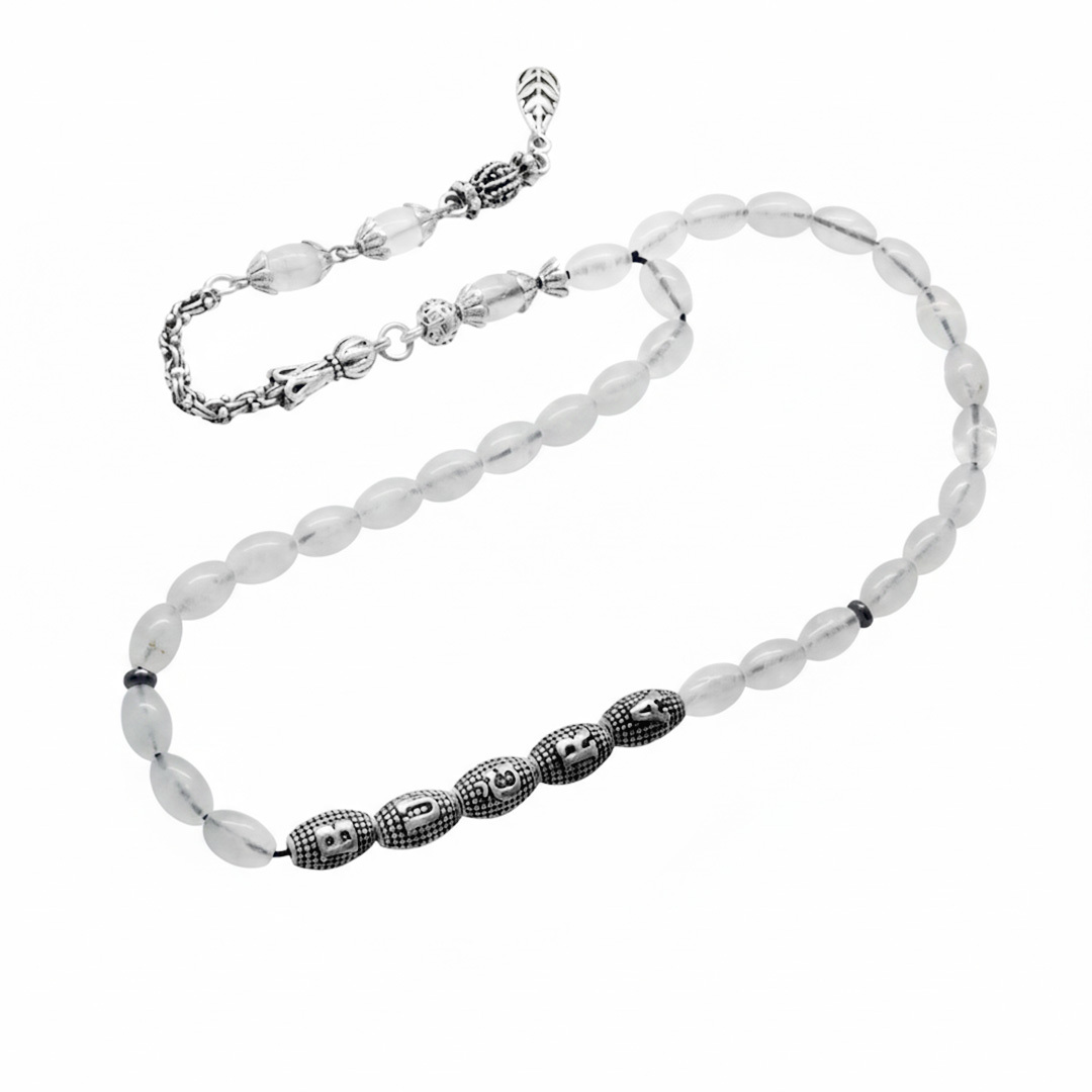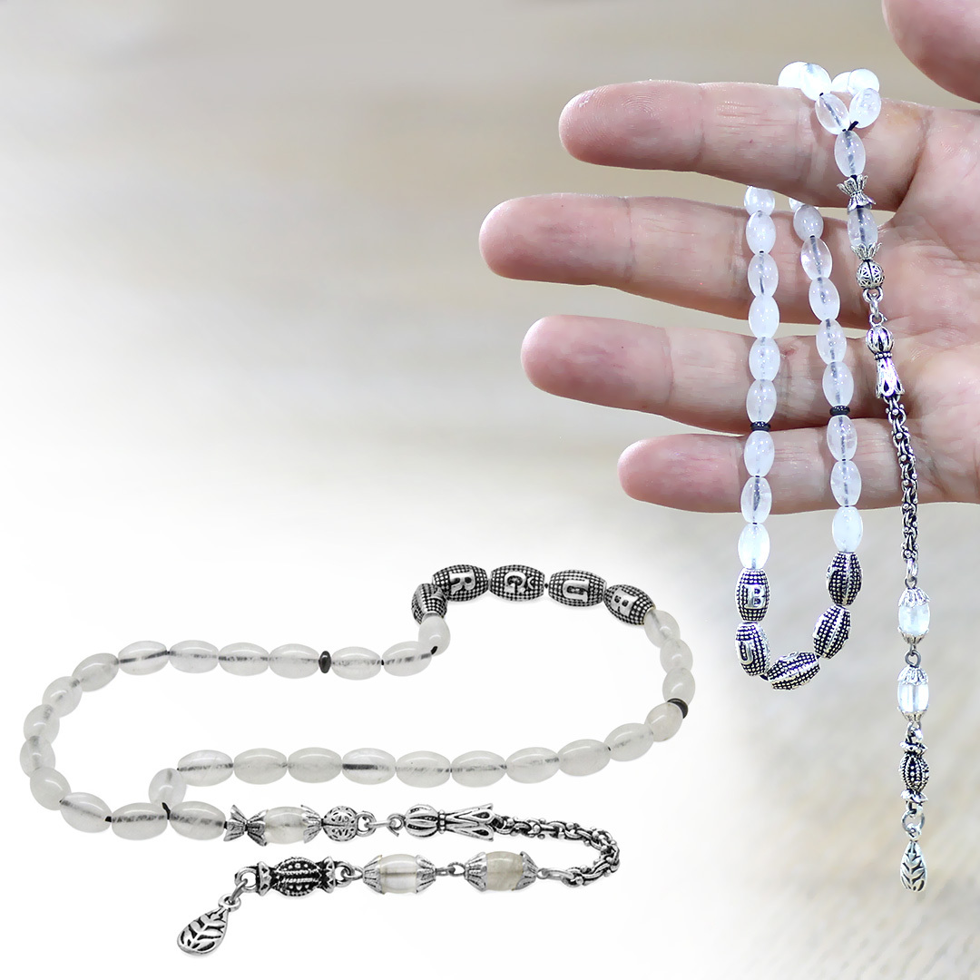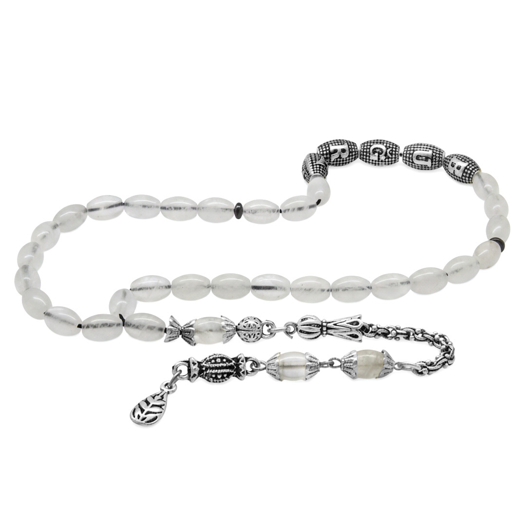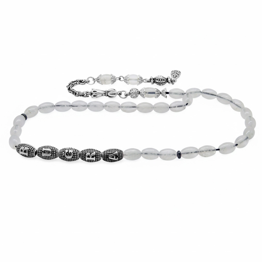 Doğaltaş Kuvars Tesbih - Kararmaz Metal Arnavut Püsküllü - Kişiye Özel İsim Yazılı - Arpa Kesim