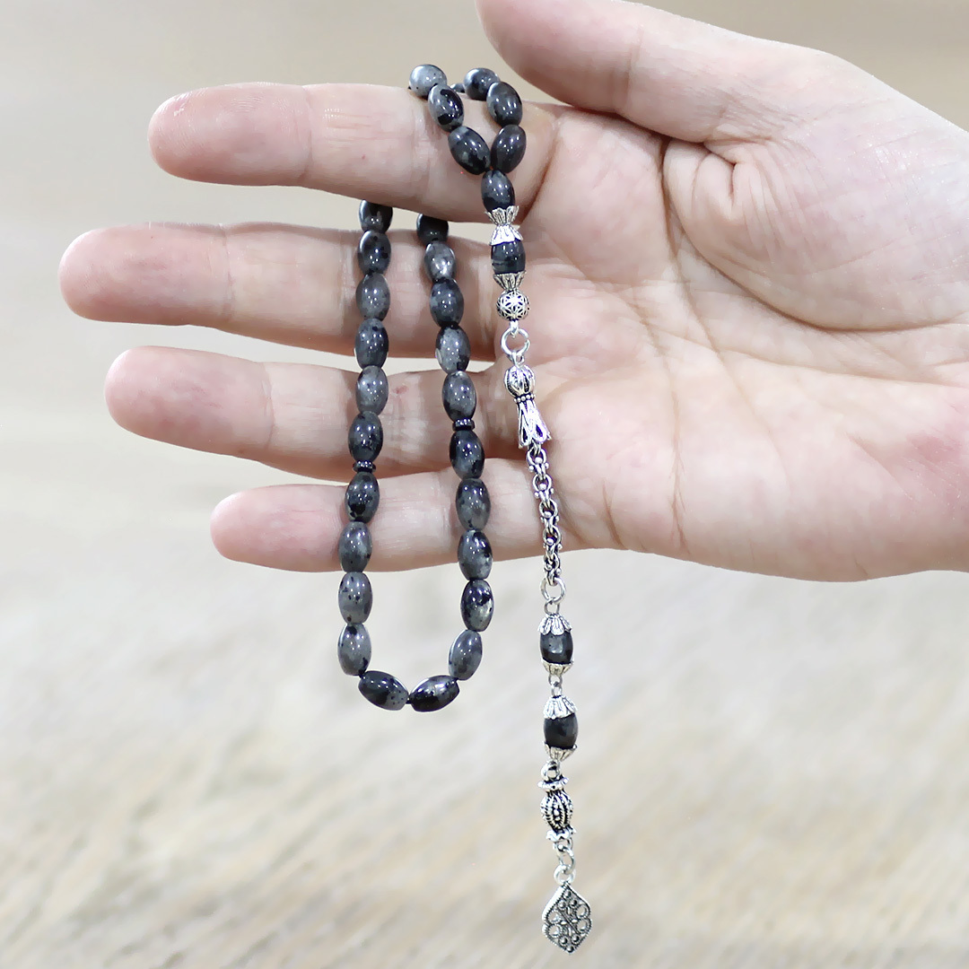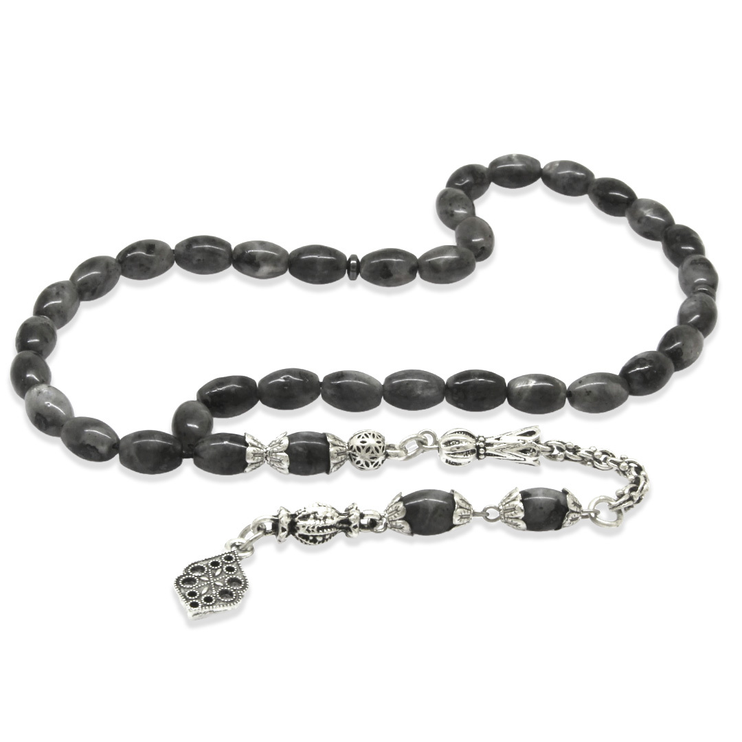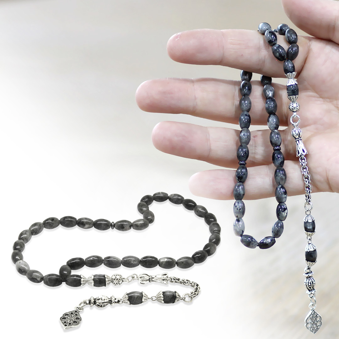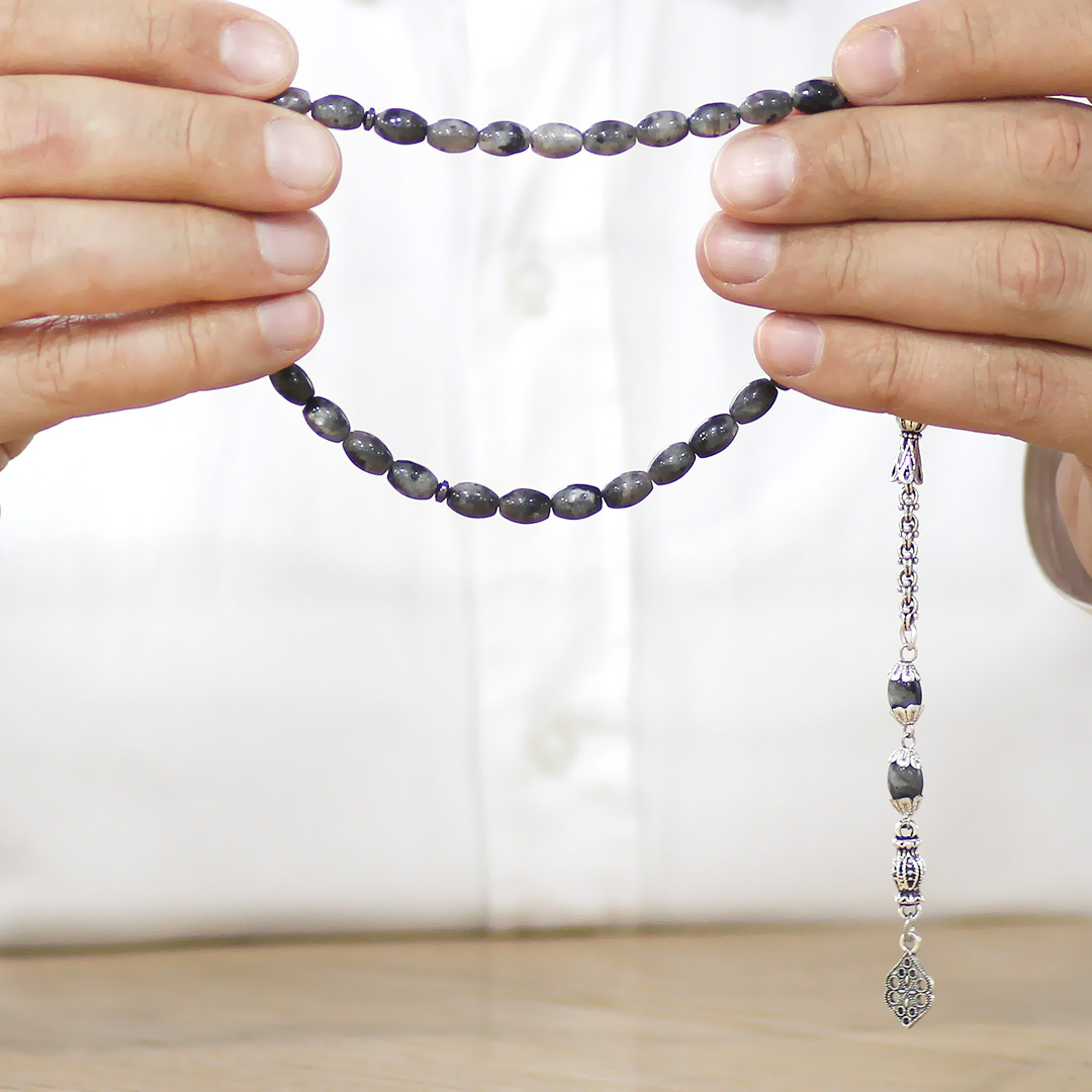 Doğaltaş Larvakit Tesbih - Kararmaz Metal Arnavut Zincir Püsküllü - Gri Beyaz Renk - Arpa Kesim