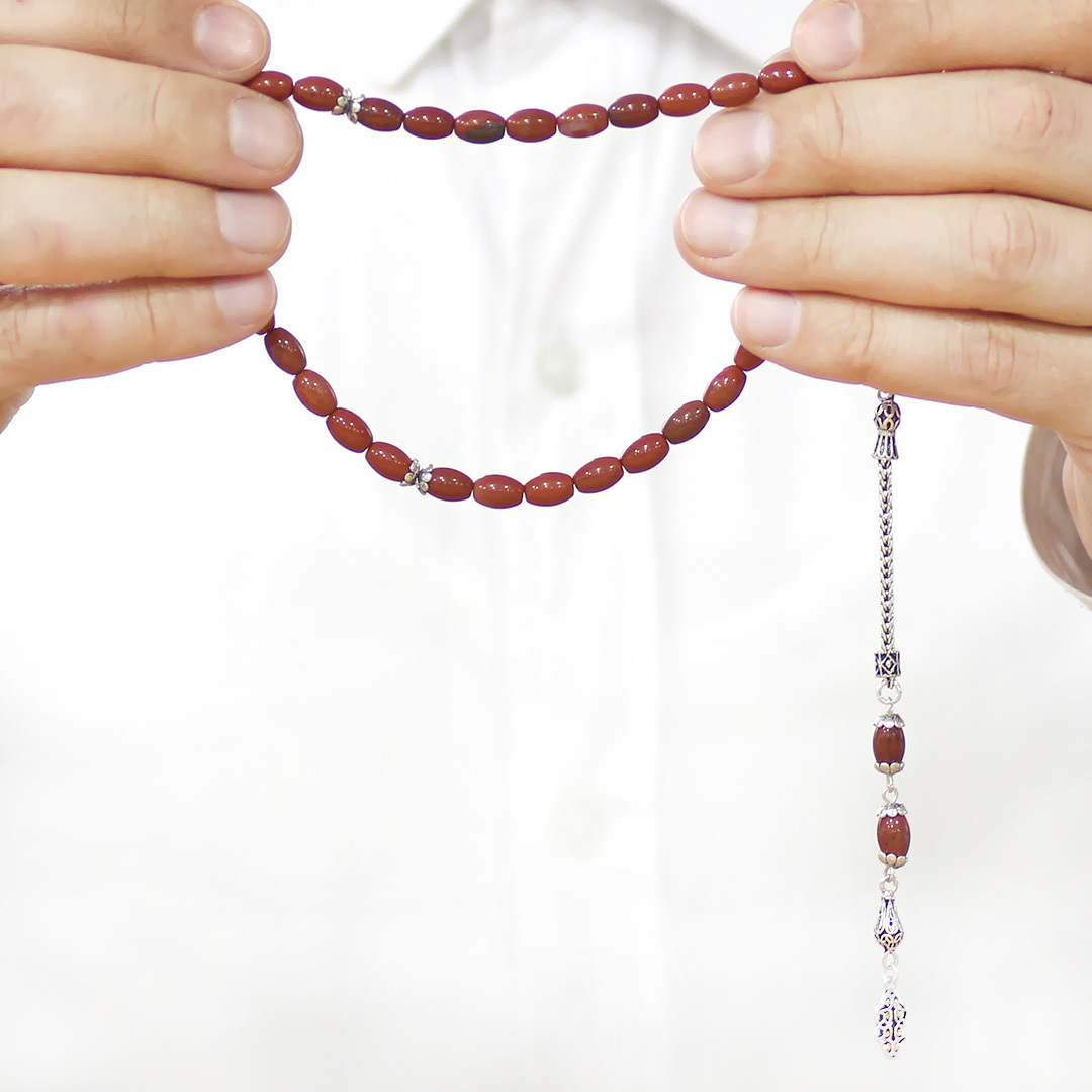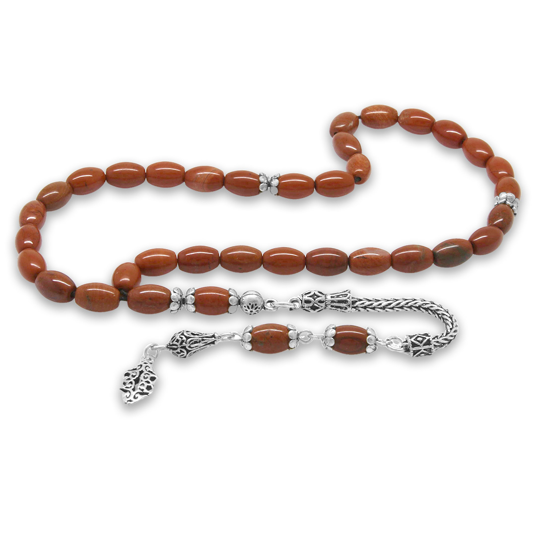 Doğaltaş Opal Tesbih - 925 Ayar Gümüş Püsküllü - Kırmızı Renk - Arpa Kesim