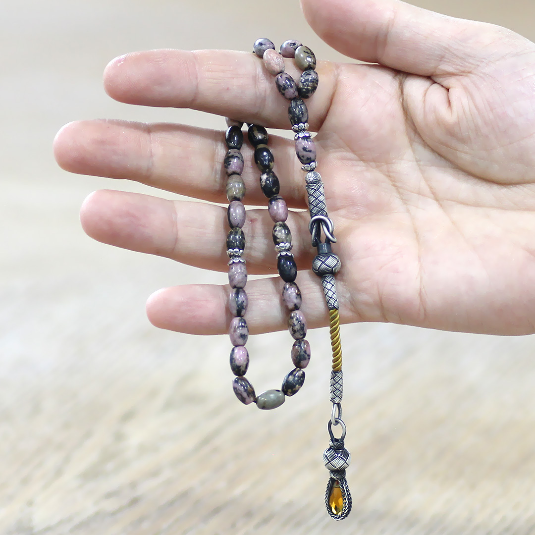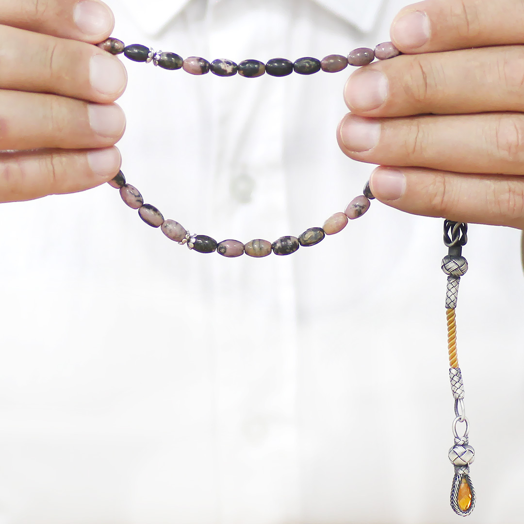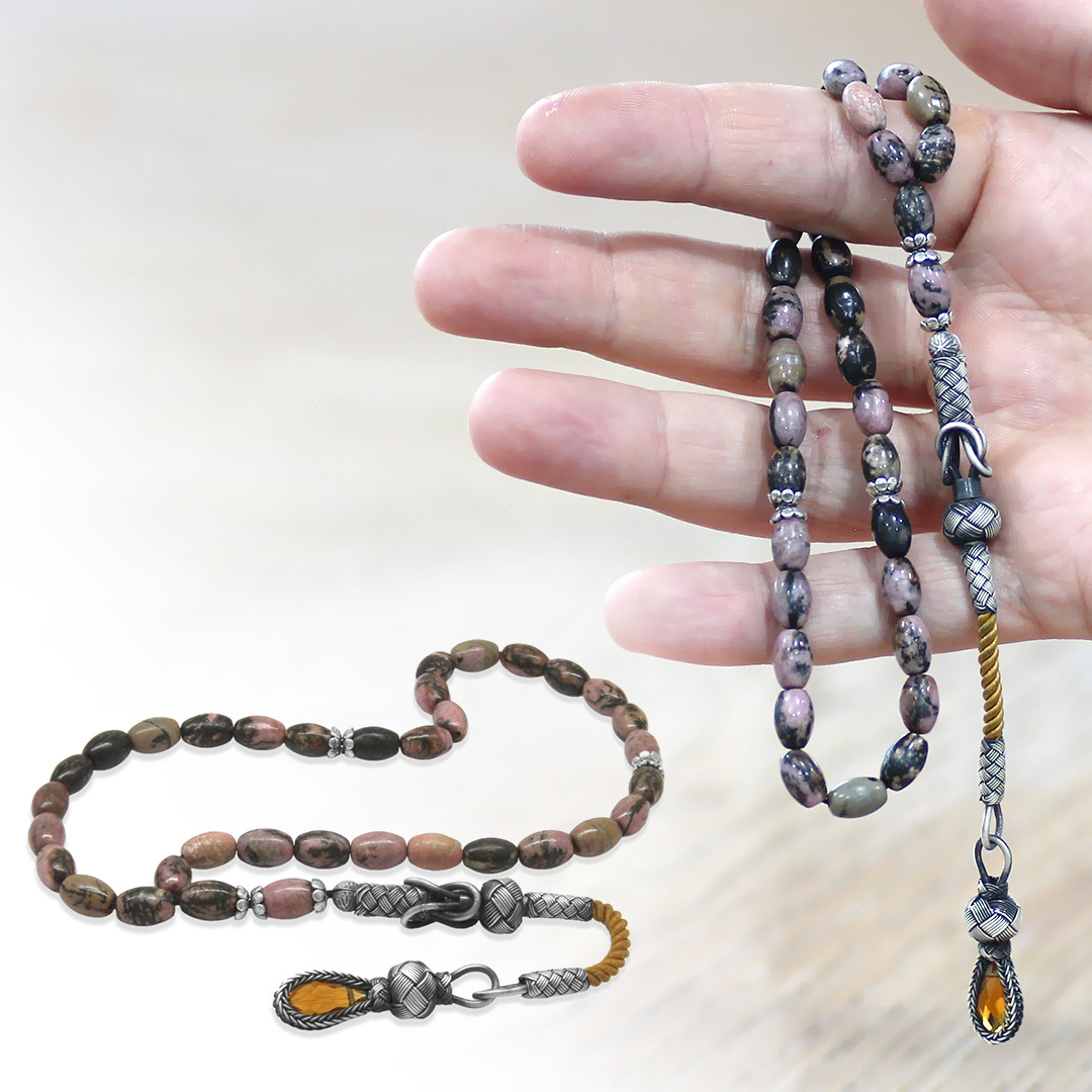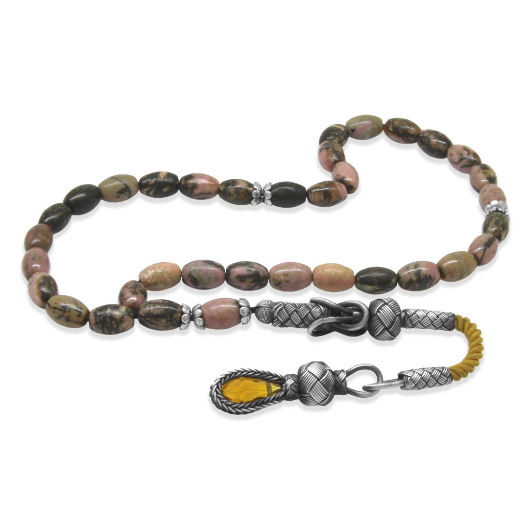 Doğaltaş Rodonit Tesbih - 1000 Ayar Gümüş Kazaz Püsküllü - Kahverengi Siyah Renk - Arpa Kesim