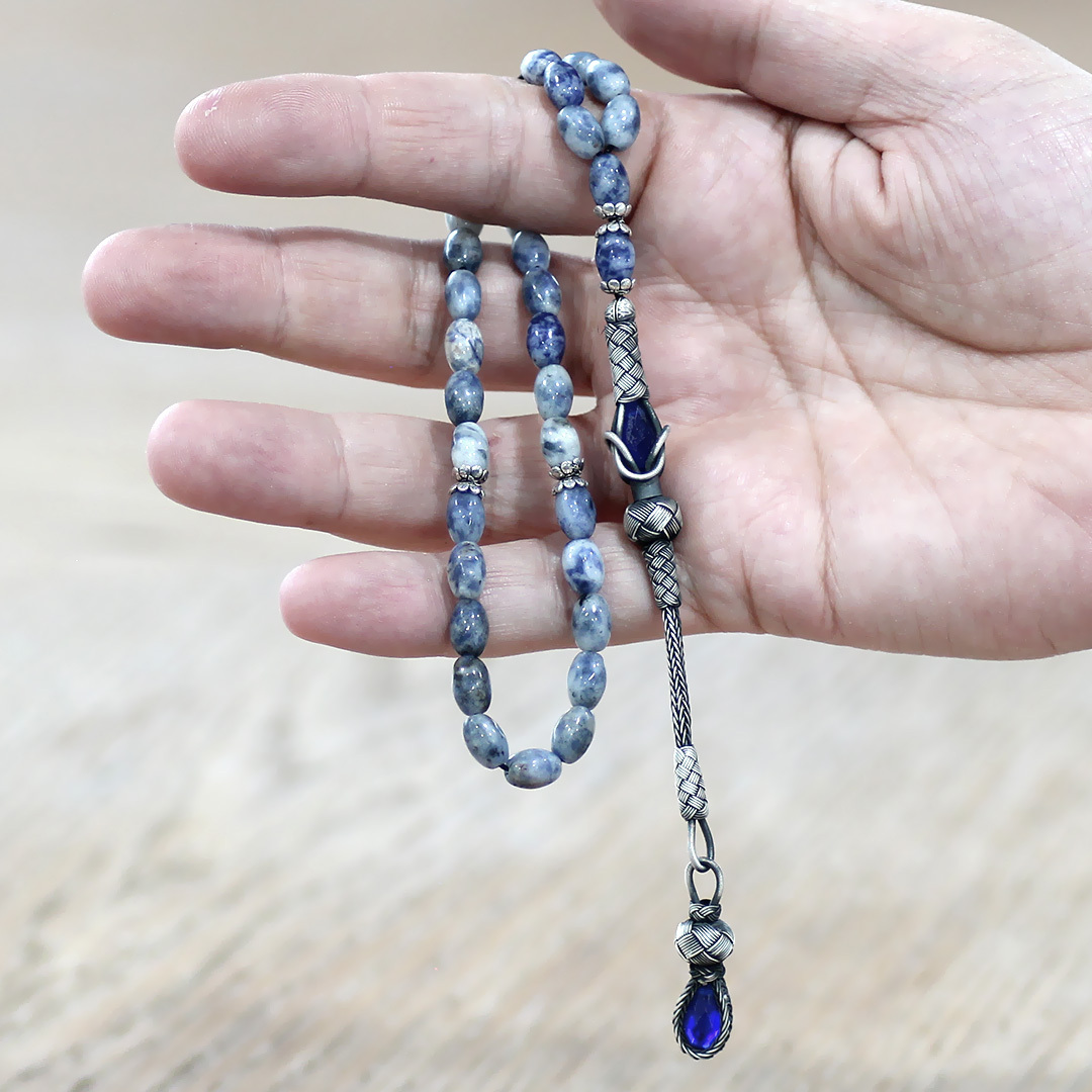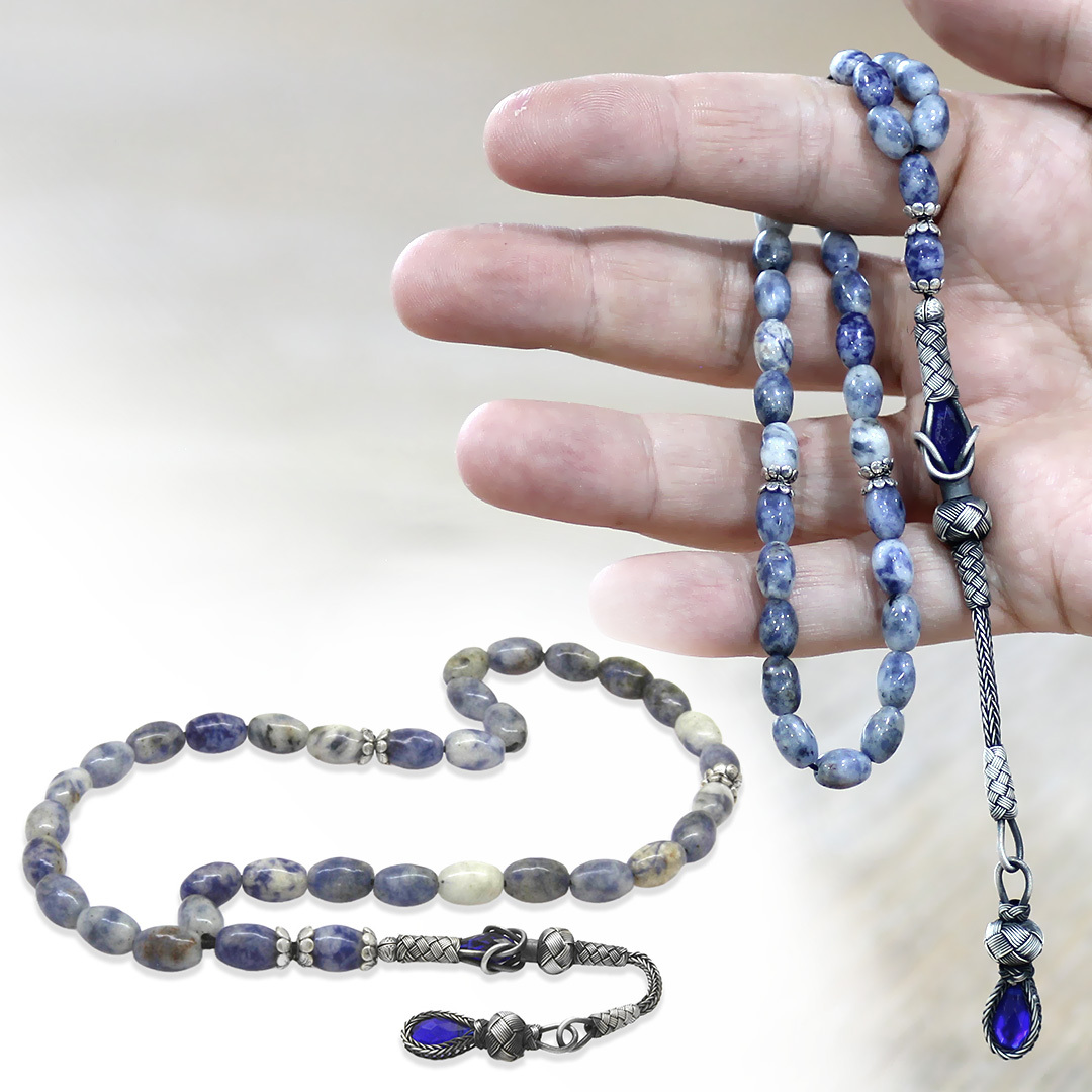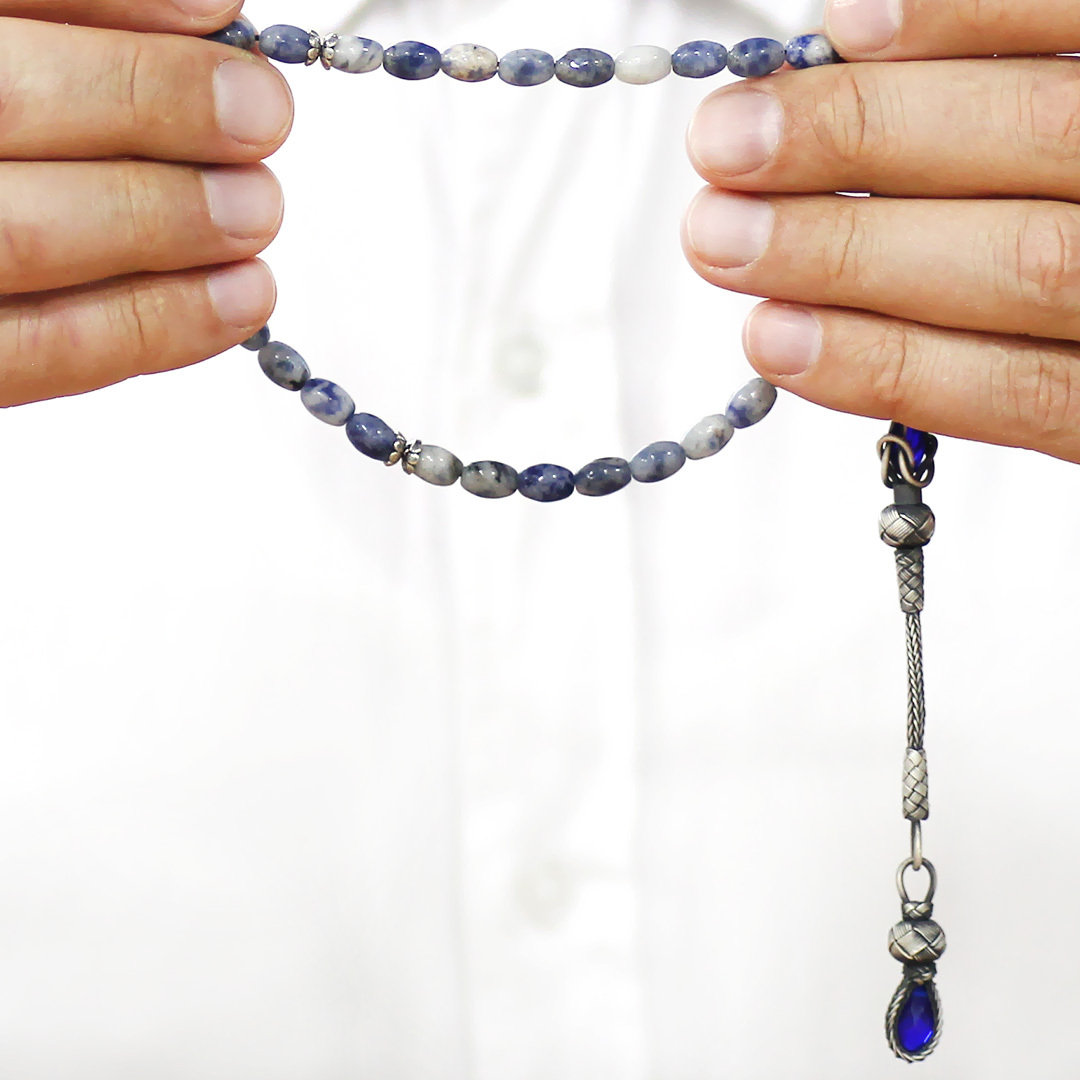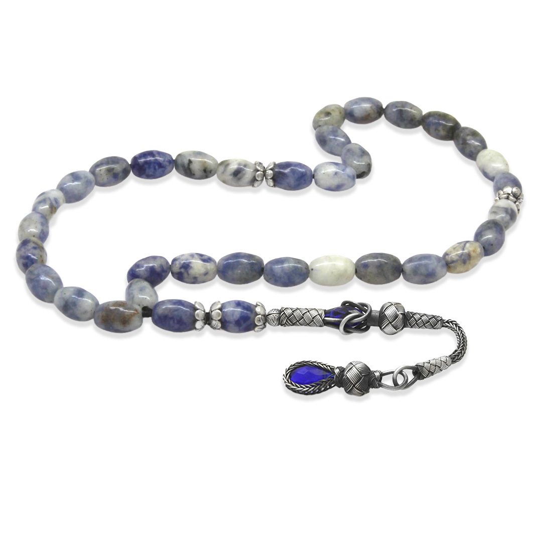 Doğaltaş Sodalit Tesbih - 1000 Ayar Gümüş Kazaz Püsküllü - Mavi Beyaz Renk - Arpa Kesim
