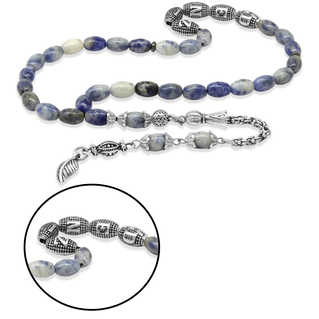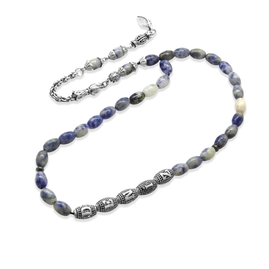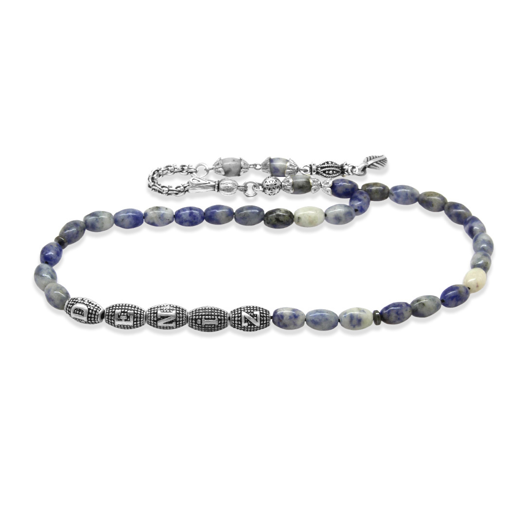 Doğaltaş Sodalit Tesbih - Kararmaz Metal Arnavut Püsküllü - Kişiye Özel İsim Yazılı - Arpa Kesim