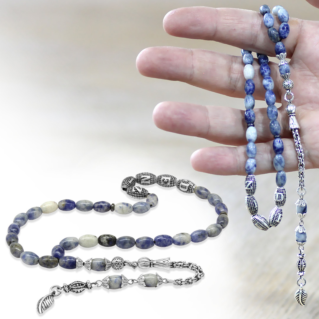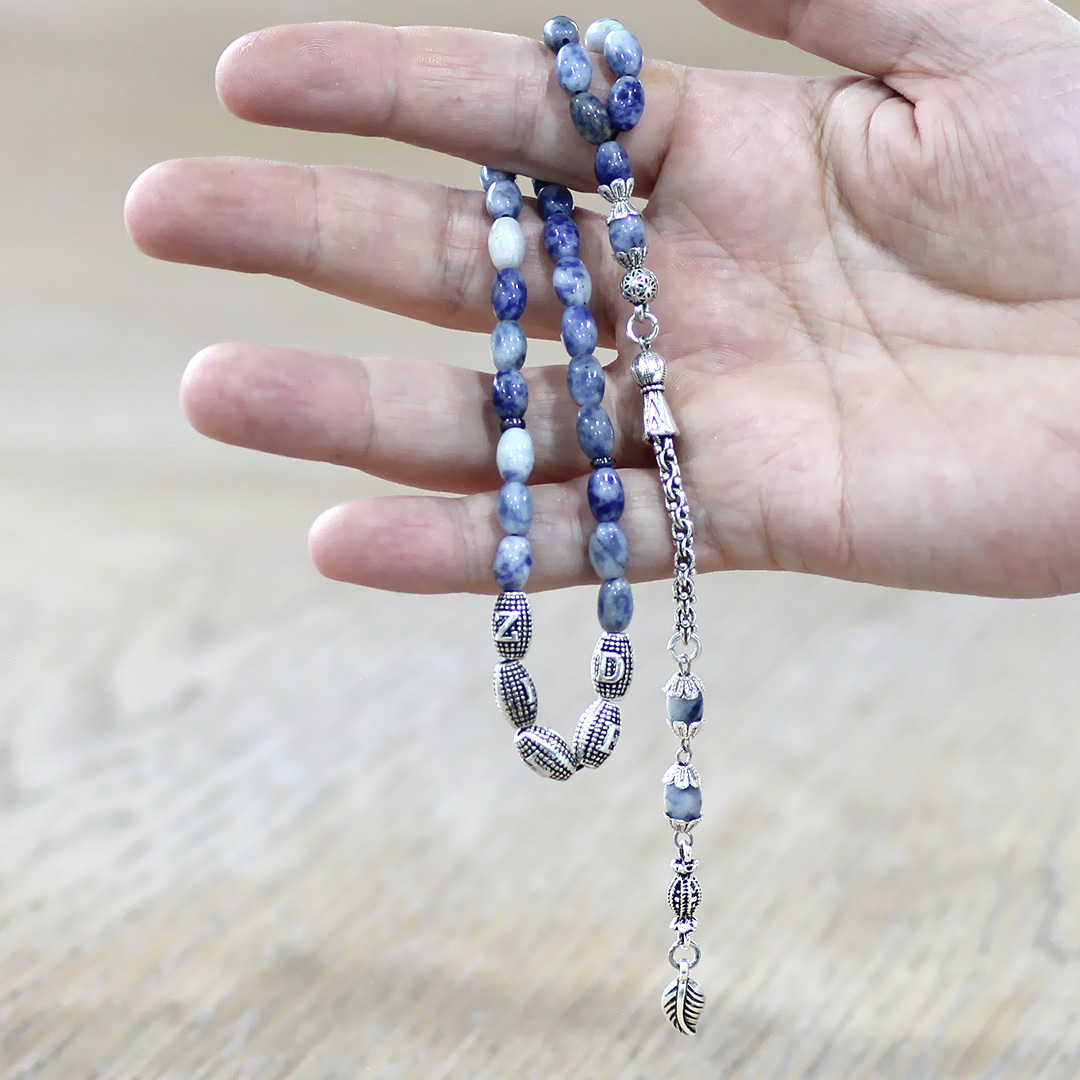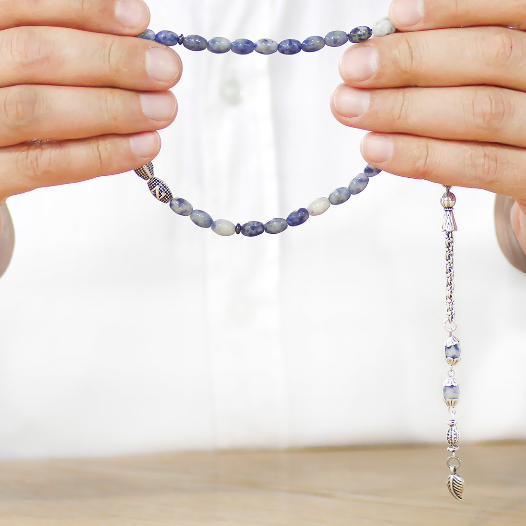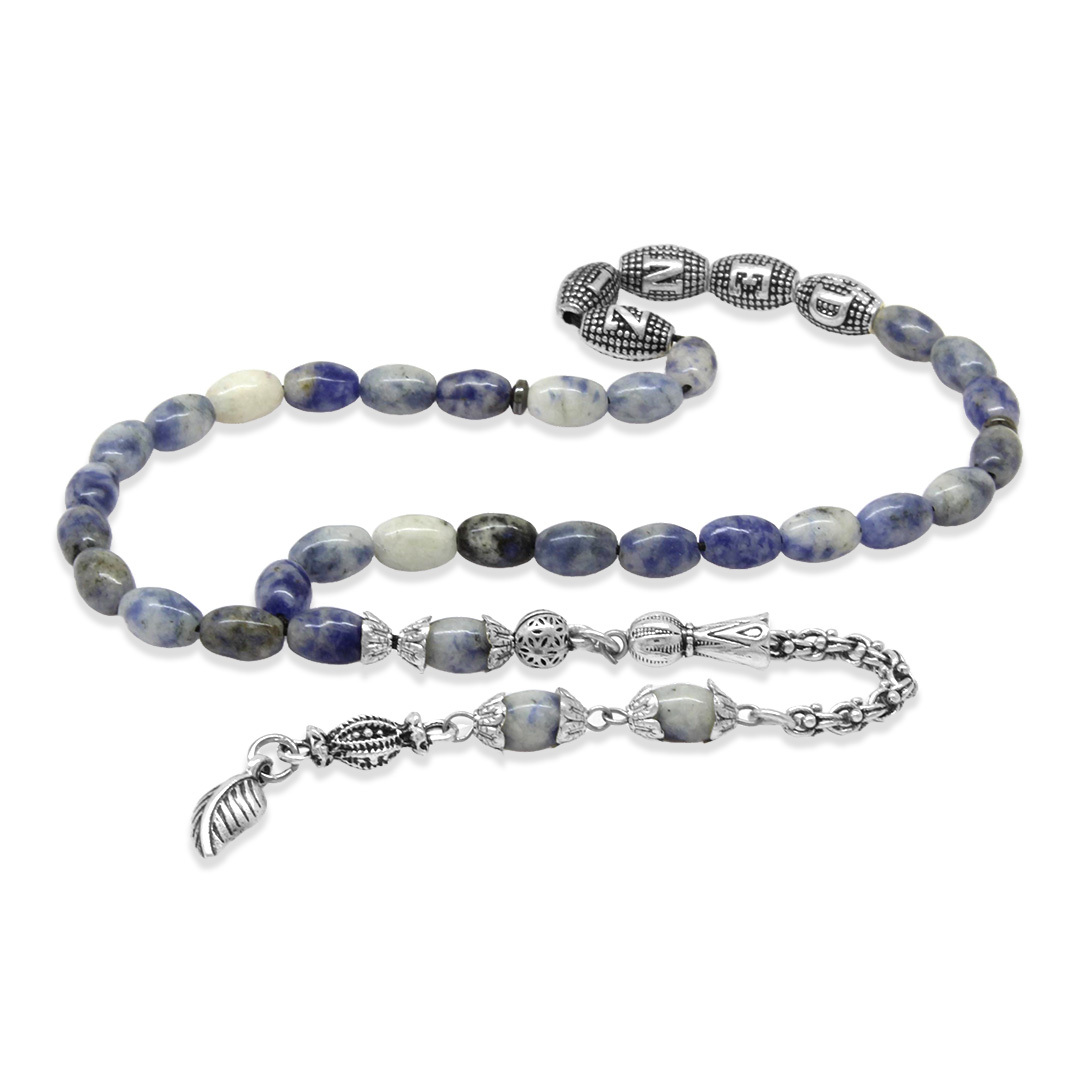 Doğaltaş Sodalit Tesbih - Kararmaz Metal Arnavut Püsküllü - Kişiye Özel İsim Yazılı - Arpa Kesim