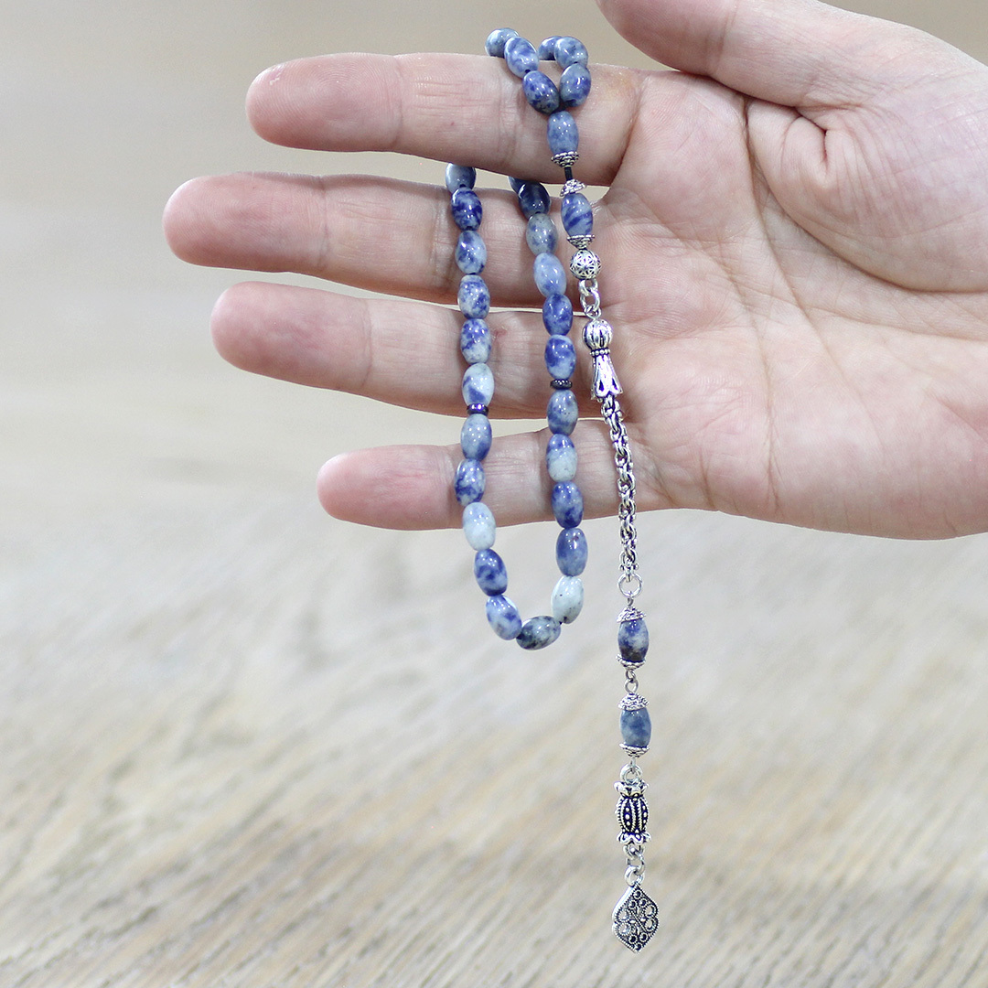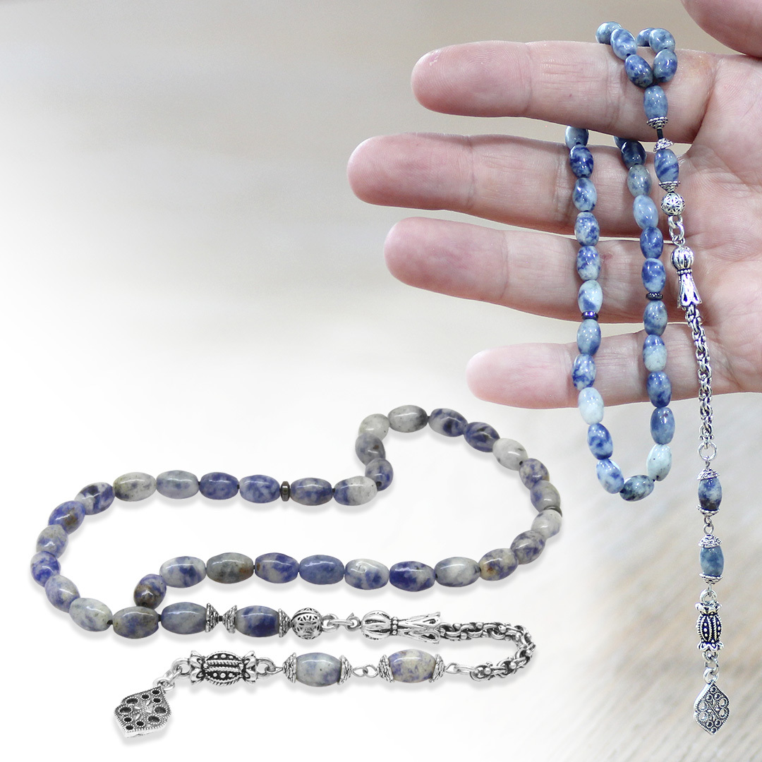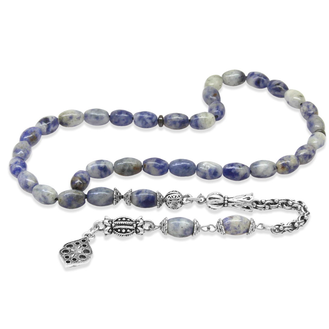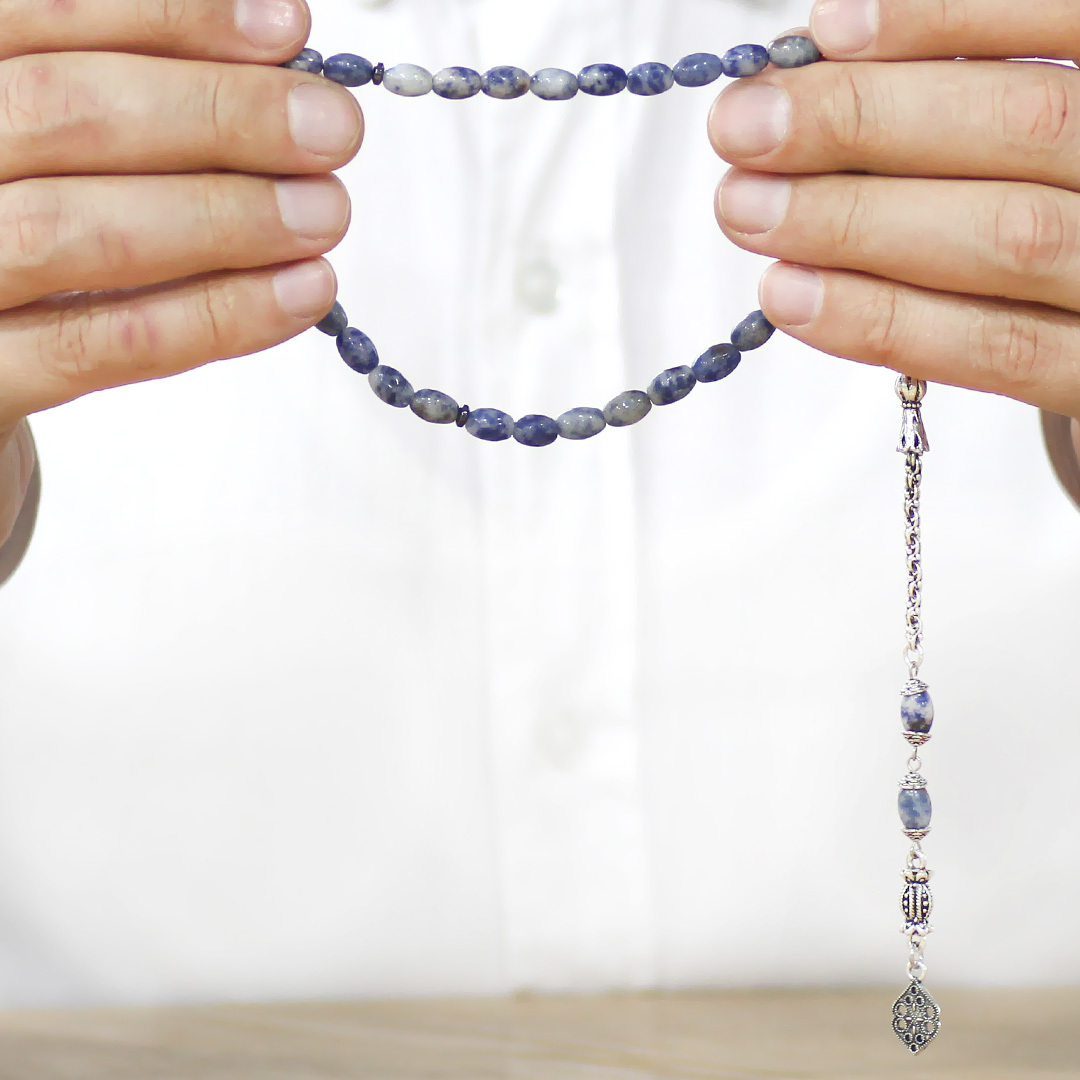 Doğaltaş Sodalit Tesbih - Kararmaz Metal Arnavut Zincir Püsküllü - Mavi Beyaz Renk - Arpa Kesim
