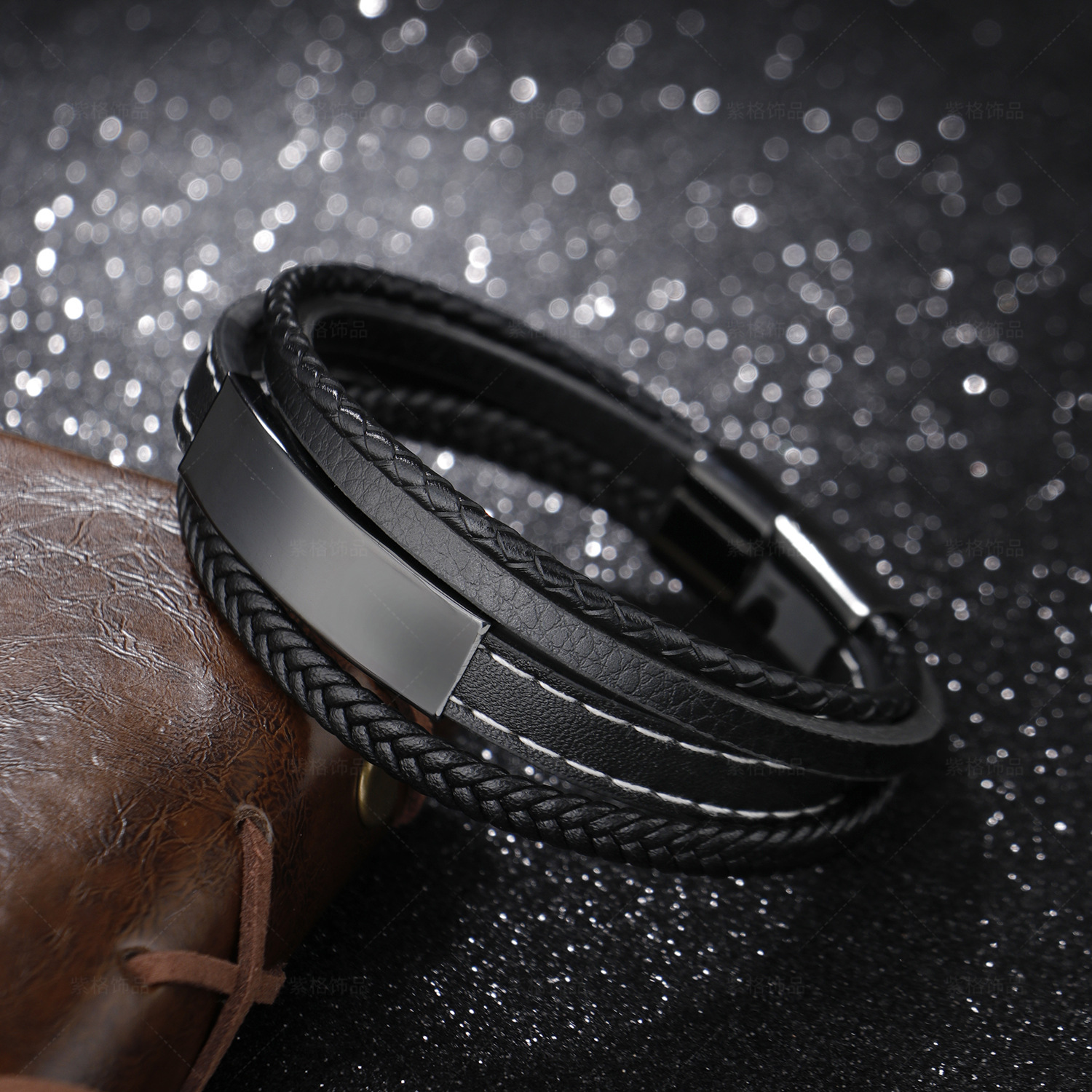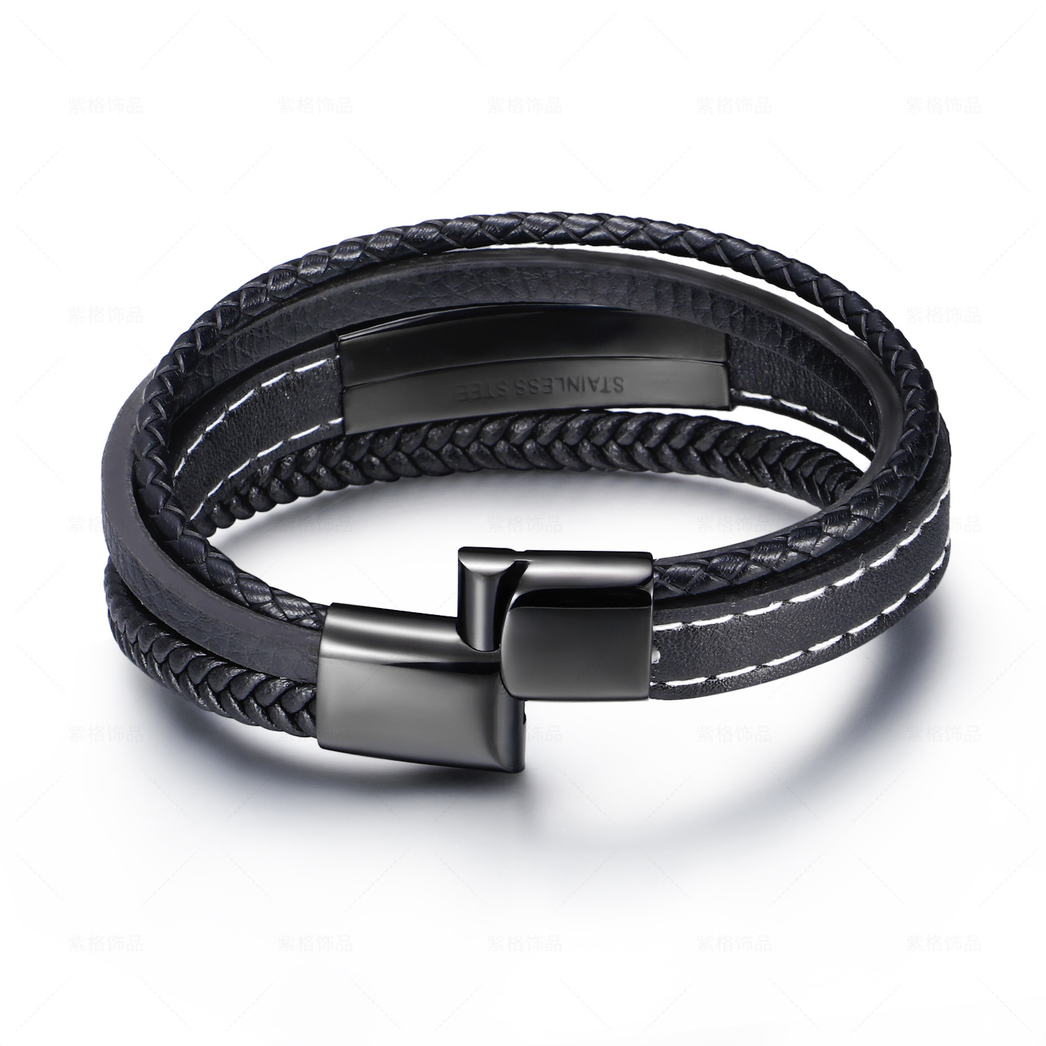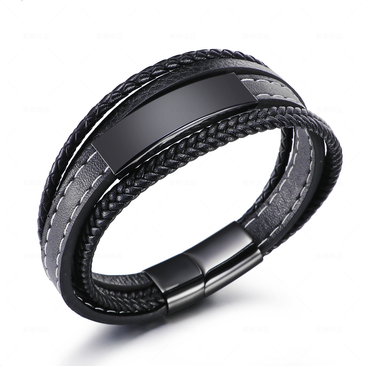 Dört Katmanlı Siyah Deri ve 316L Kalite Çelik Bileşim İsme Özel Veya Harf Yazılı Erkek Bileklik - 1