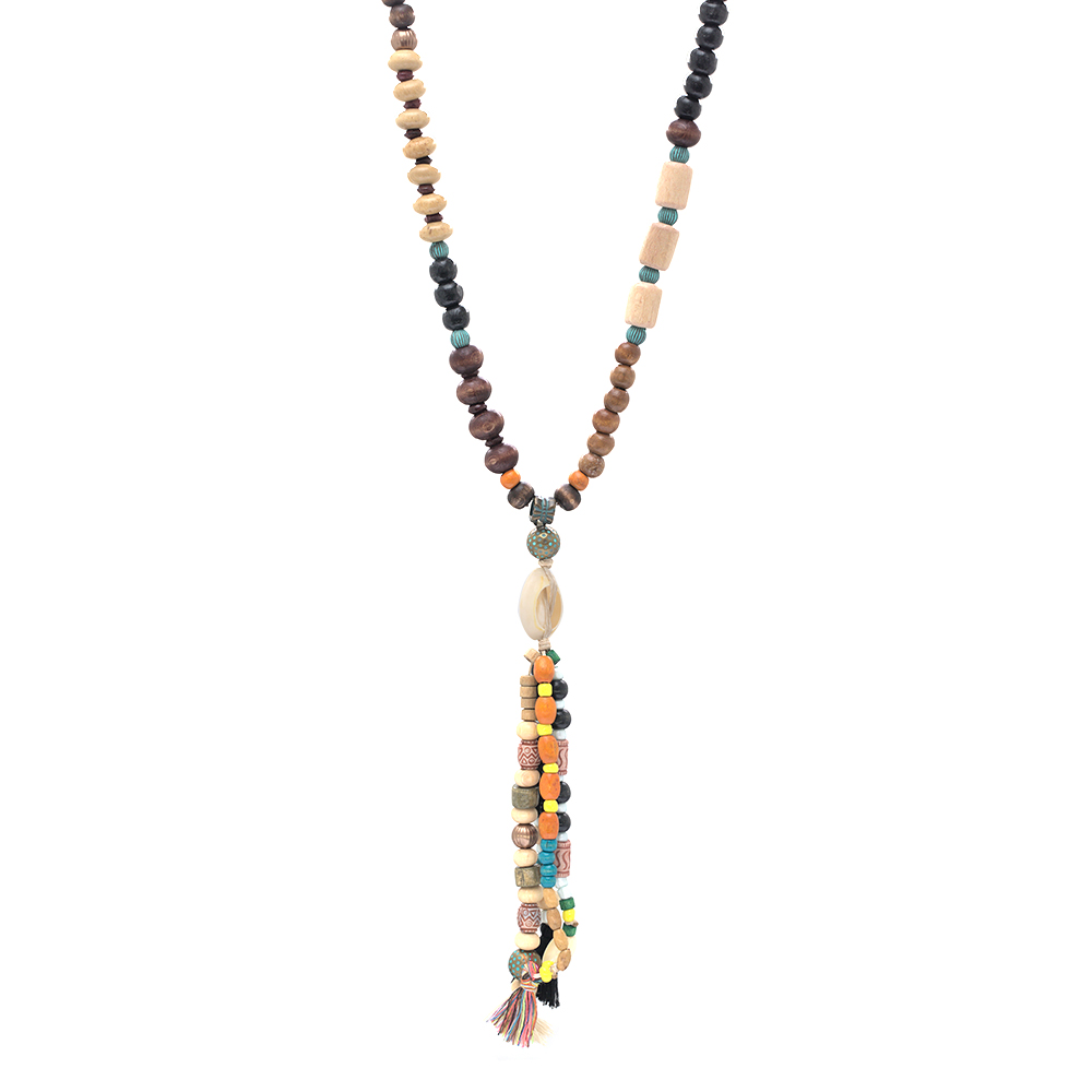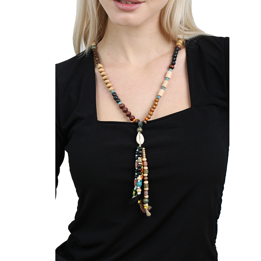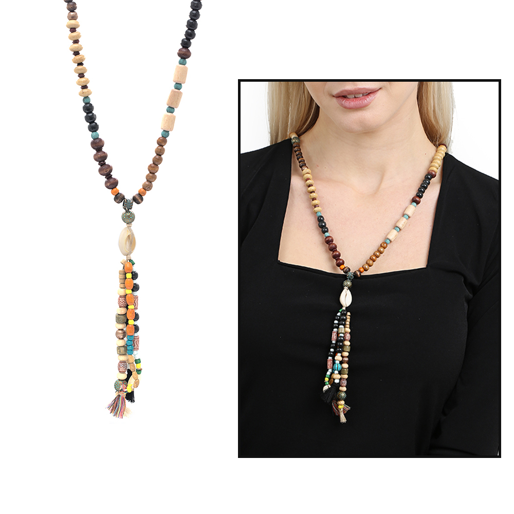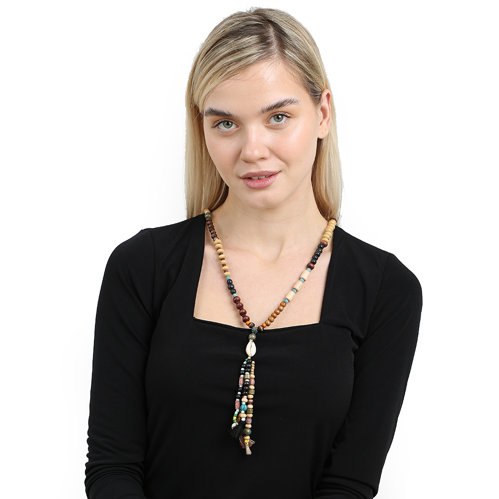 El Yapımı Etnik Ahşap Kombinli Siyah Renk Geçişli Deniz Kabuğu Detaylı Otantik Kolye