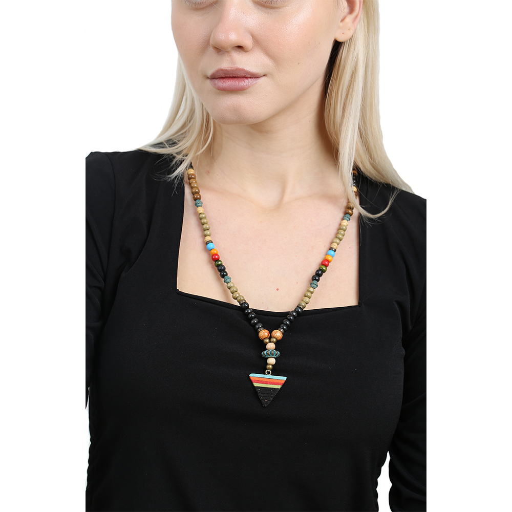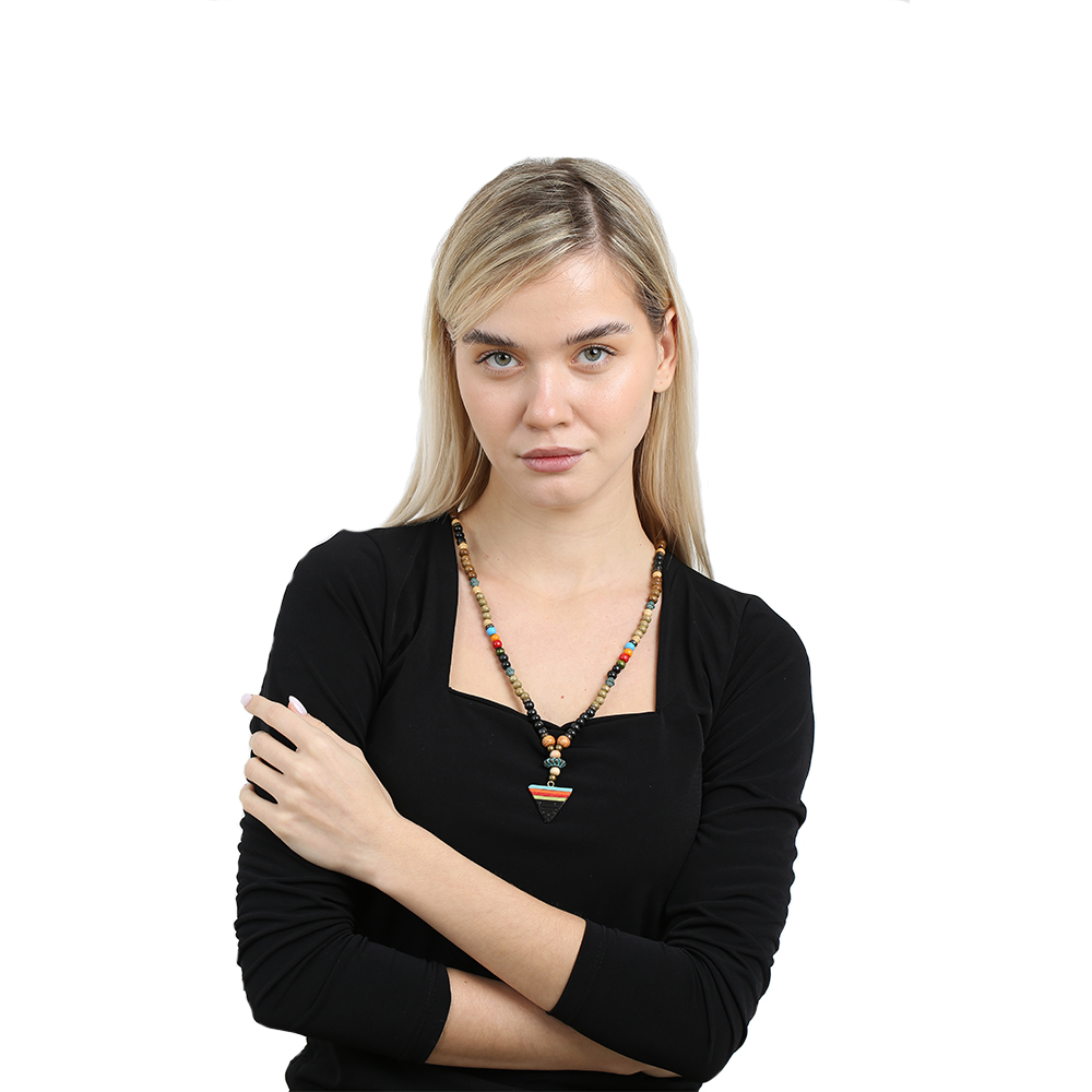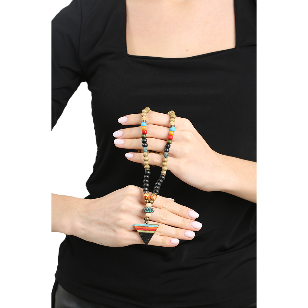 El Yapımı Etnik Ahşap Kombinli Siyah Renk Geçişli Mızrak Uçlu Otantik Kolye