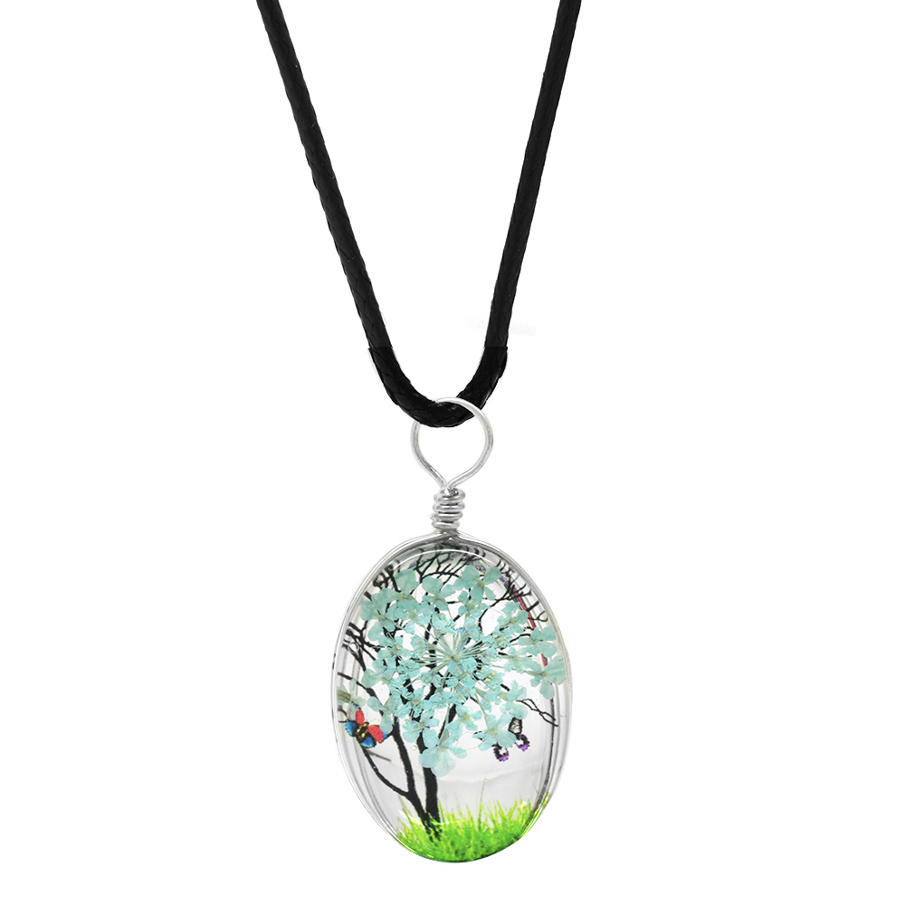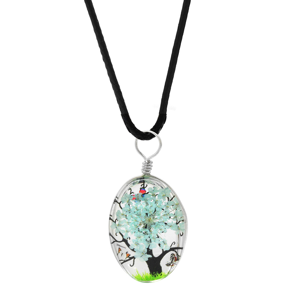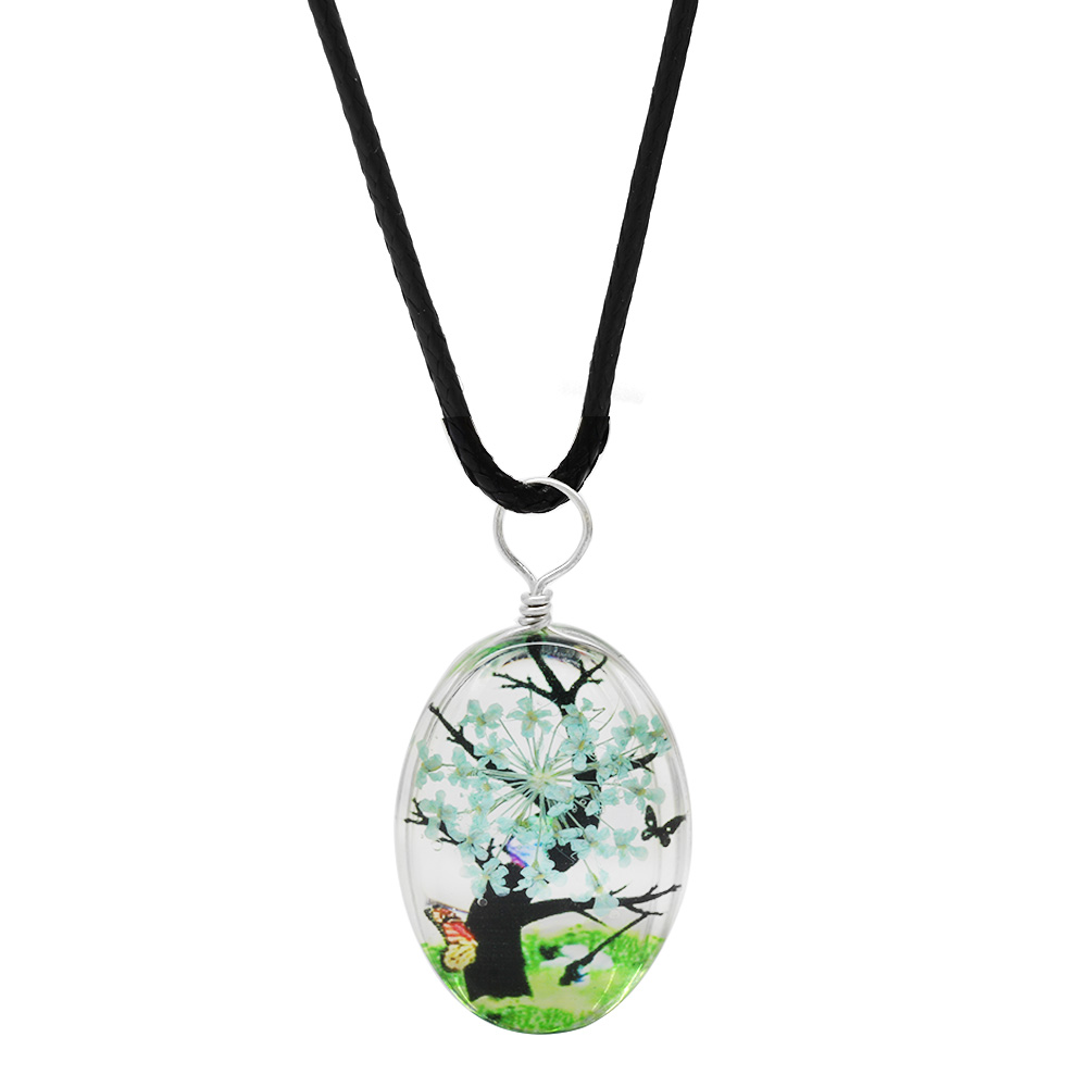 Elips Tasarım Beyaz Çiçekli Doğa Temalı El Yapımı Natural Reçine Kolye