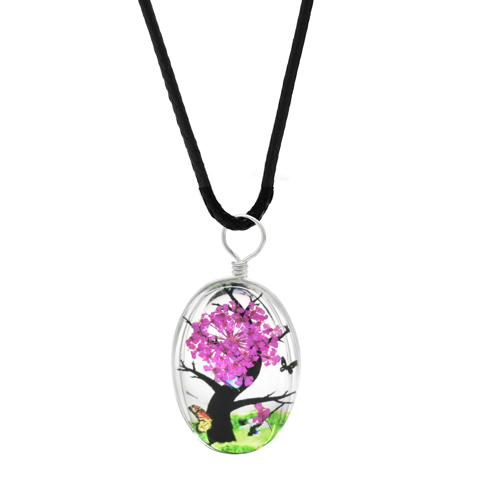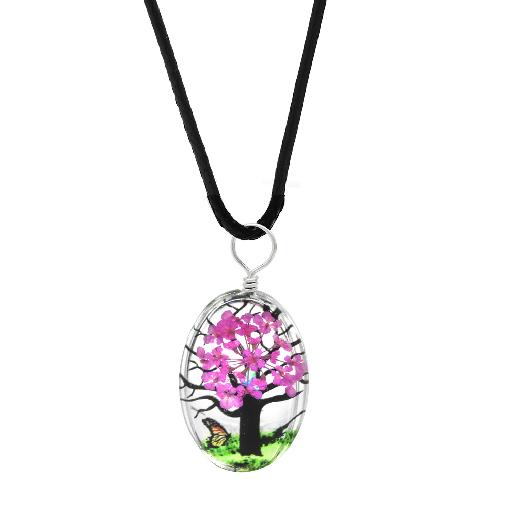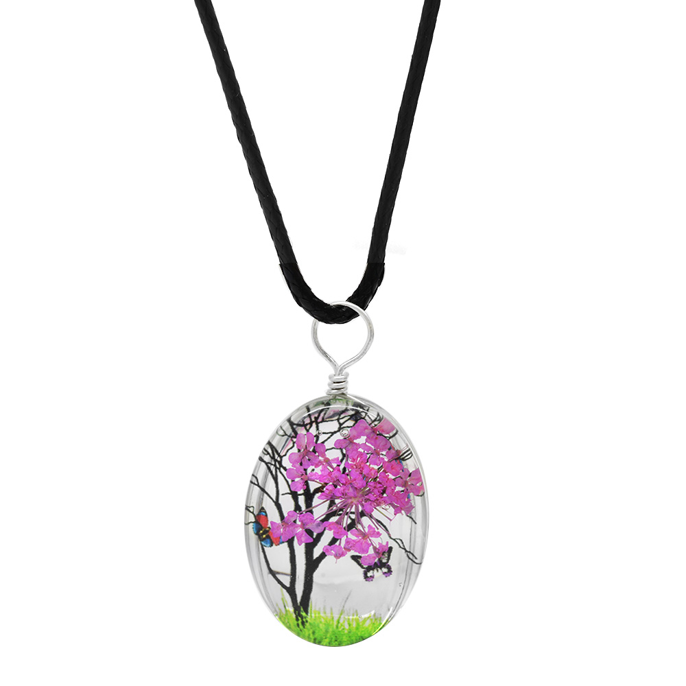 Elips Tasarım Fuşya Çiçekli Doğa Temalı El Yapımı Natural Reçine Kolye