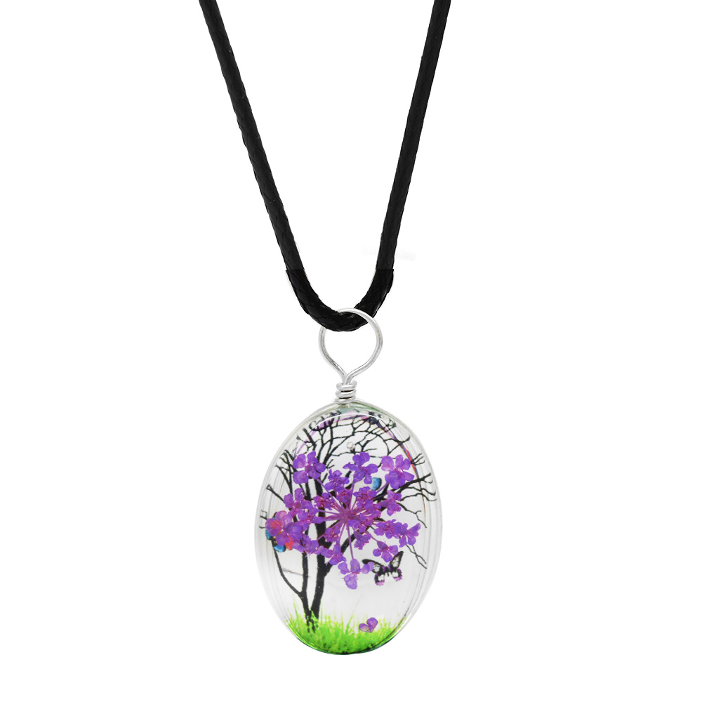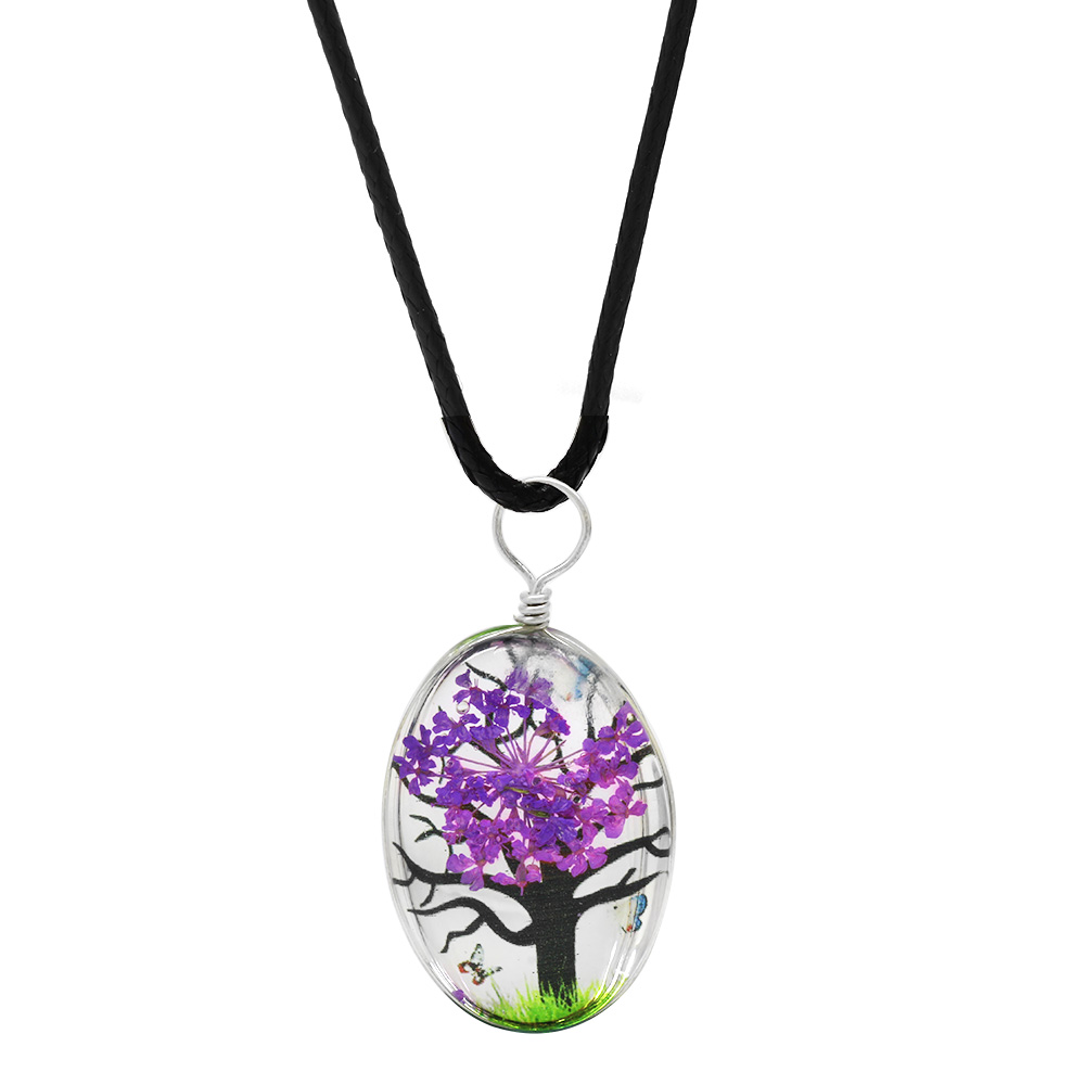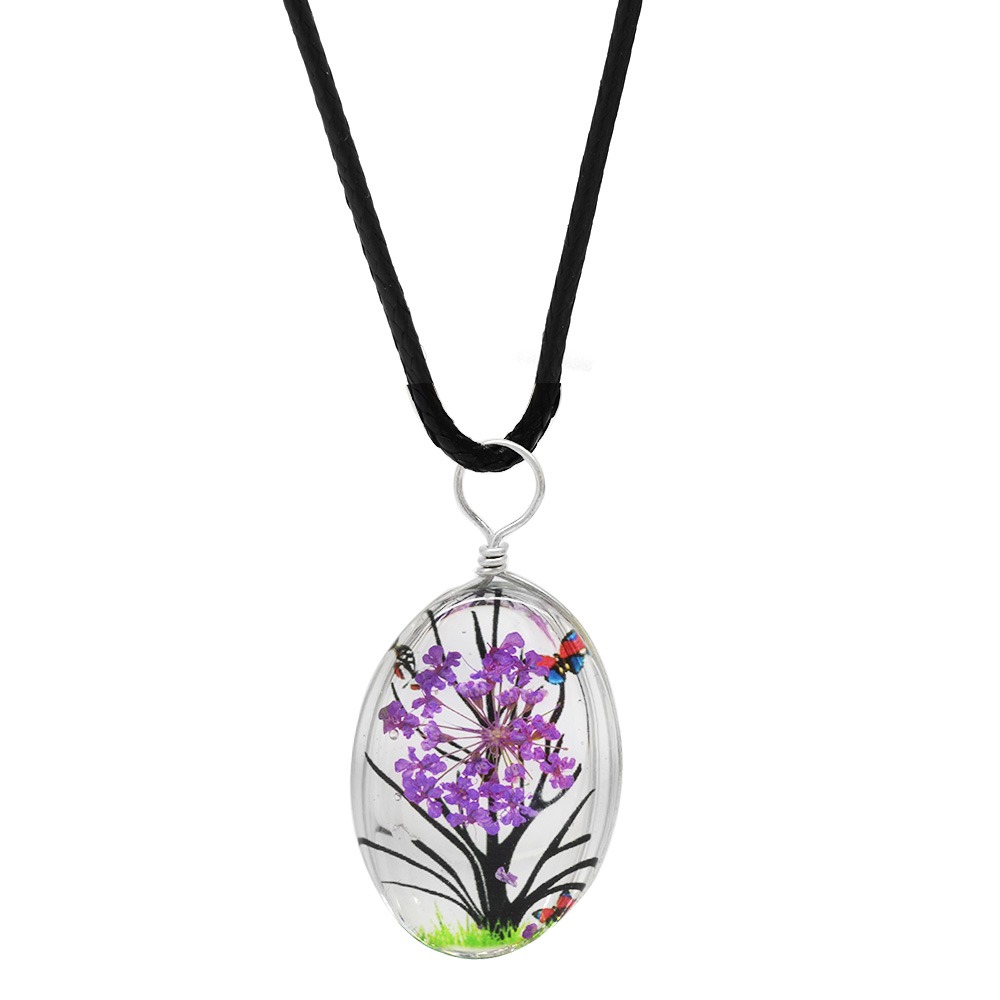 Elips Tasarım Mor Çiçekli Doğa Temalı El Yapımı Natural Reçine Kolye