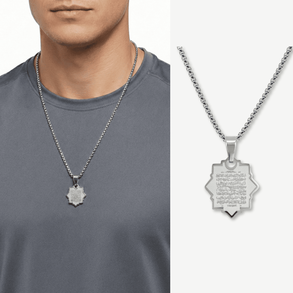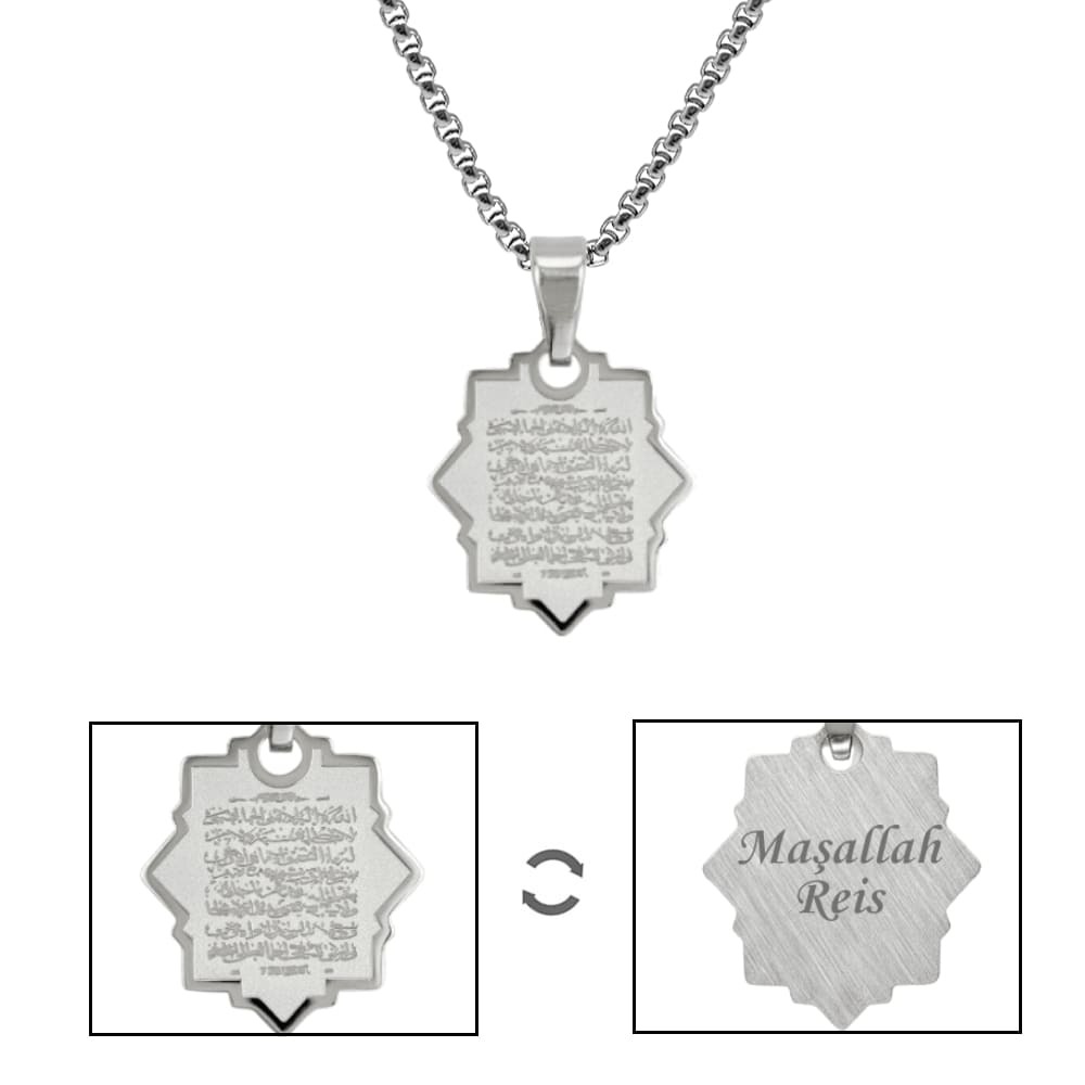 Erkek Çelik Kolye - Ayetel Kürsi Yazılı - Kişiye Özel - Gümüş Renk - Yıldız Tasarım - 60 cm