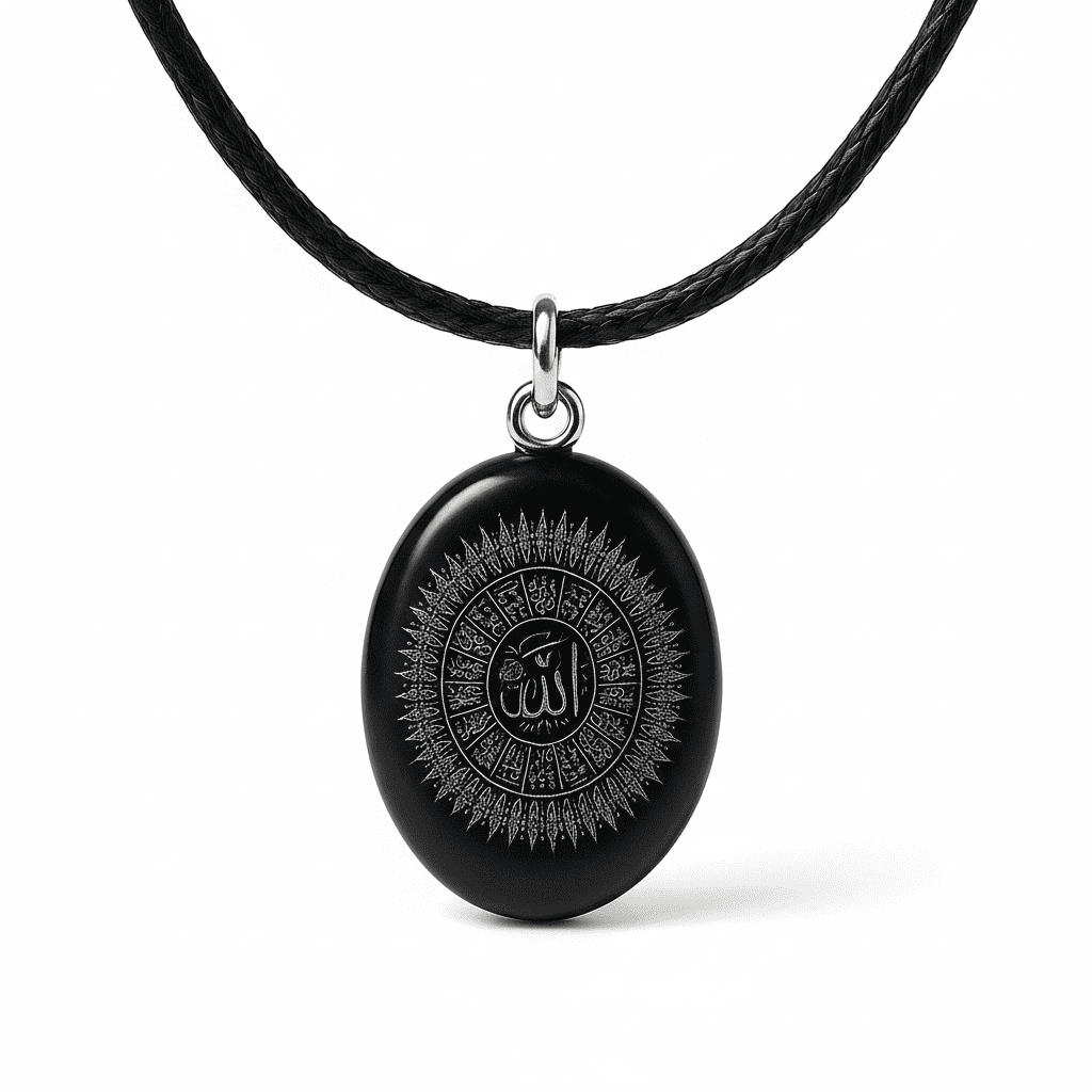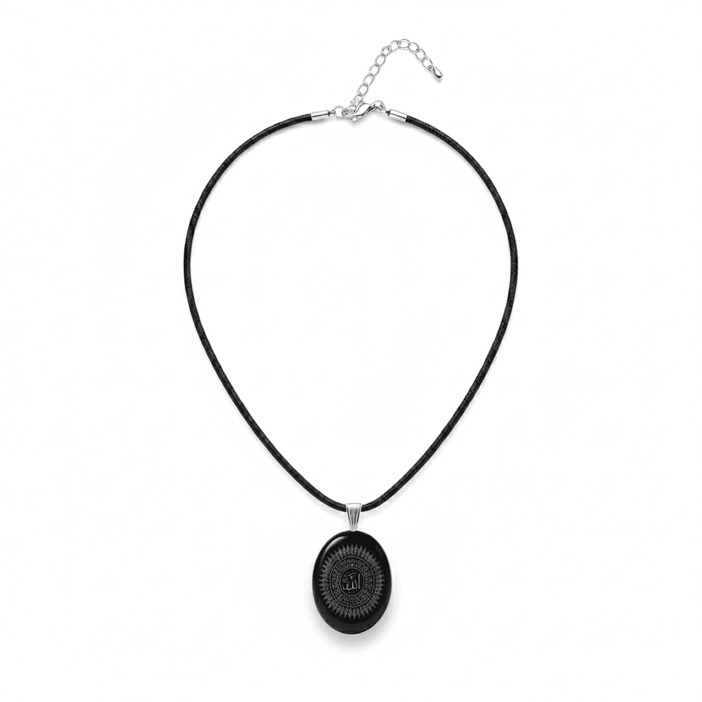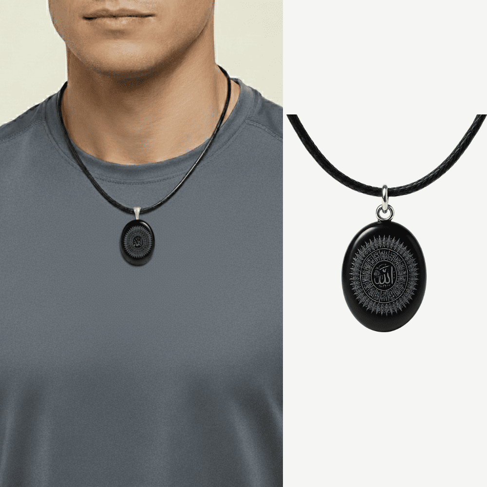 Erkek Oniks Doğaltaş Cevşen Kolye - Esmaül Hüsna Yazılı - Elips Tasarım - Siyah Renk