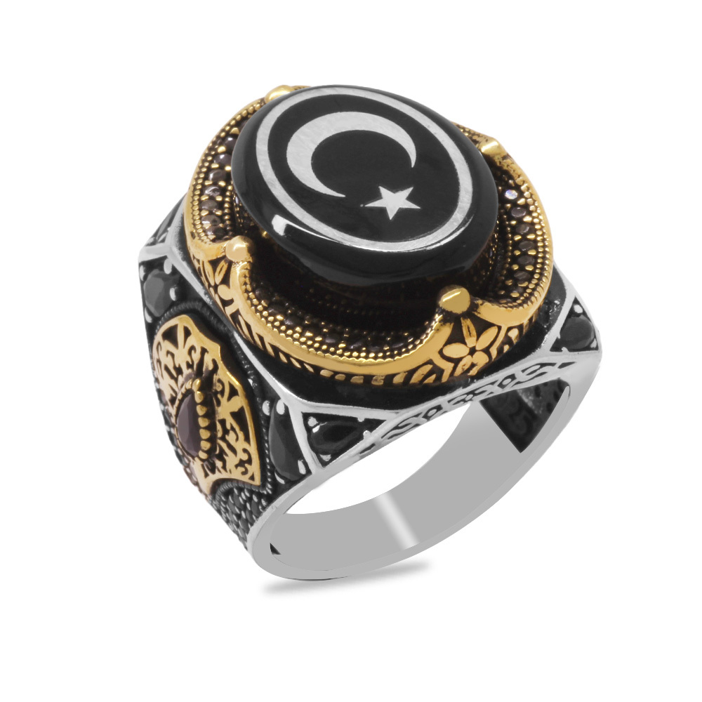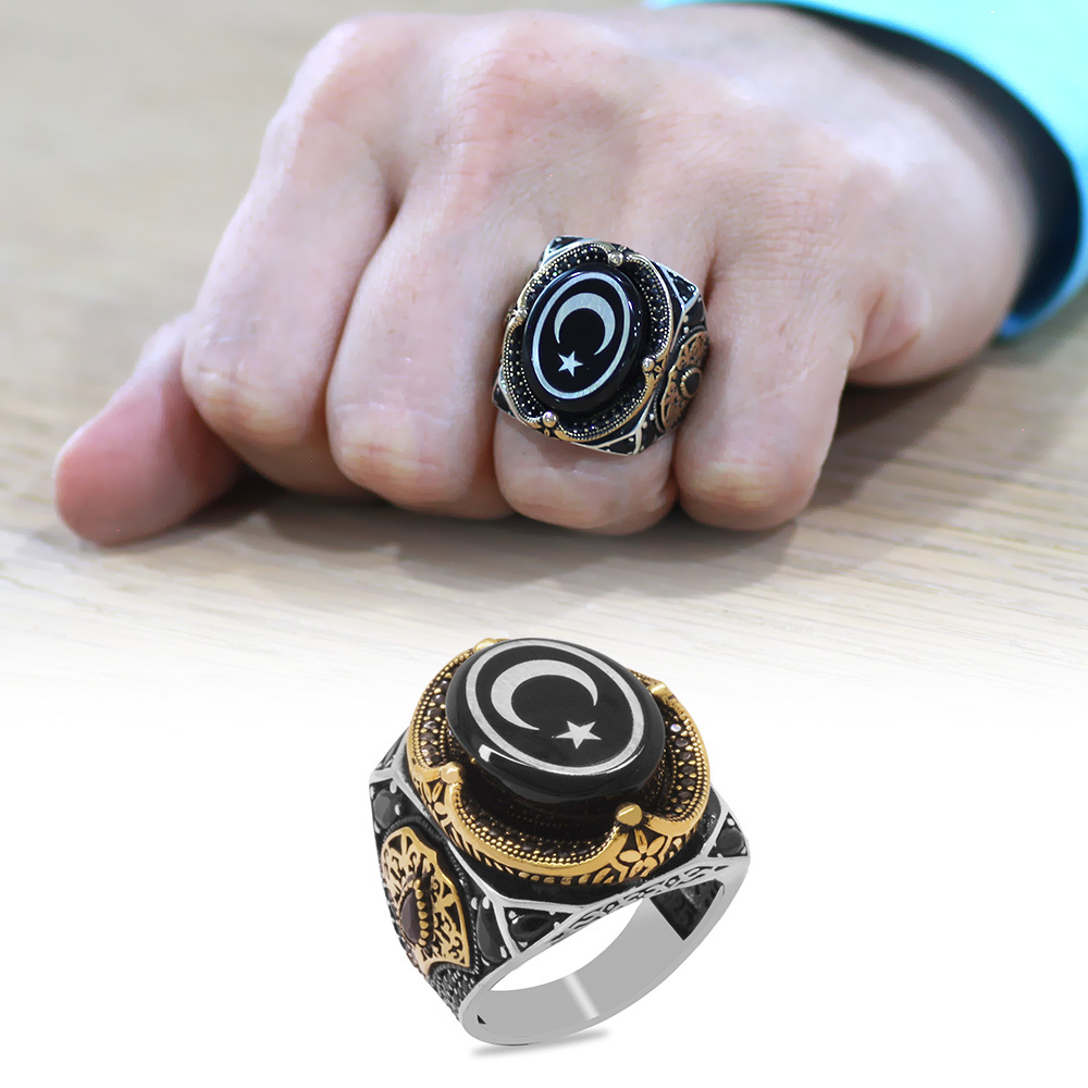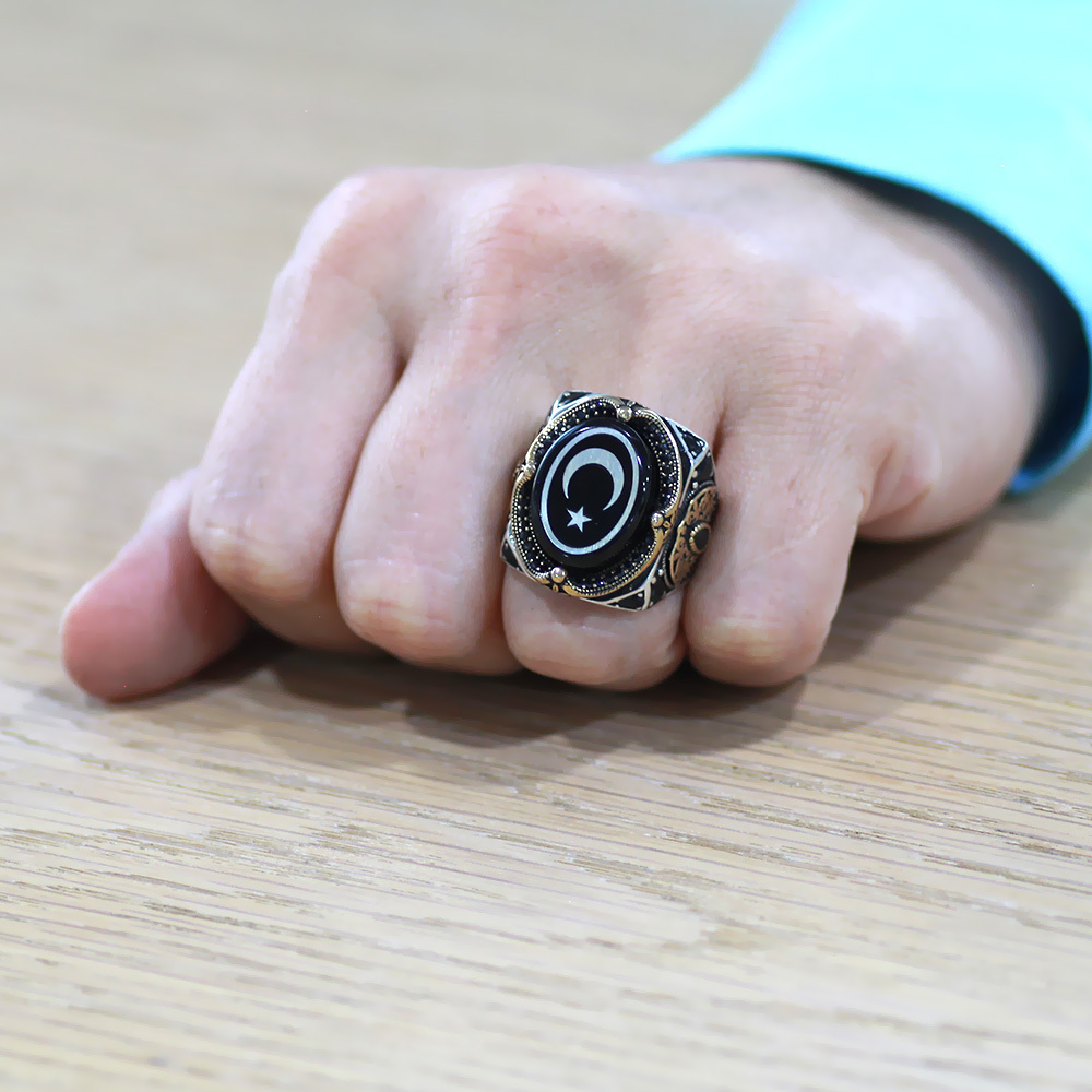 Erzurum Oltu Taşı Üzeri Ayyıldız İşlemeli Kenarları Zirkon Koleksiyonluk 925 Ayar Gümüş Erkek Yüzük