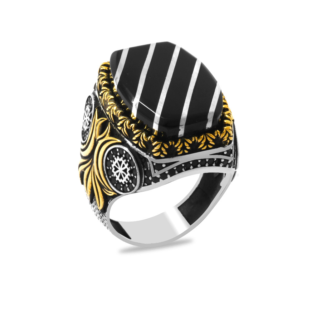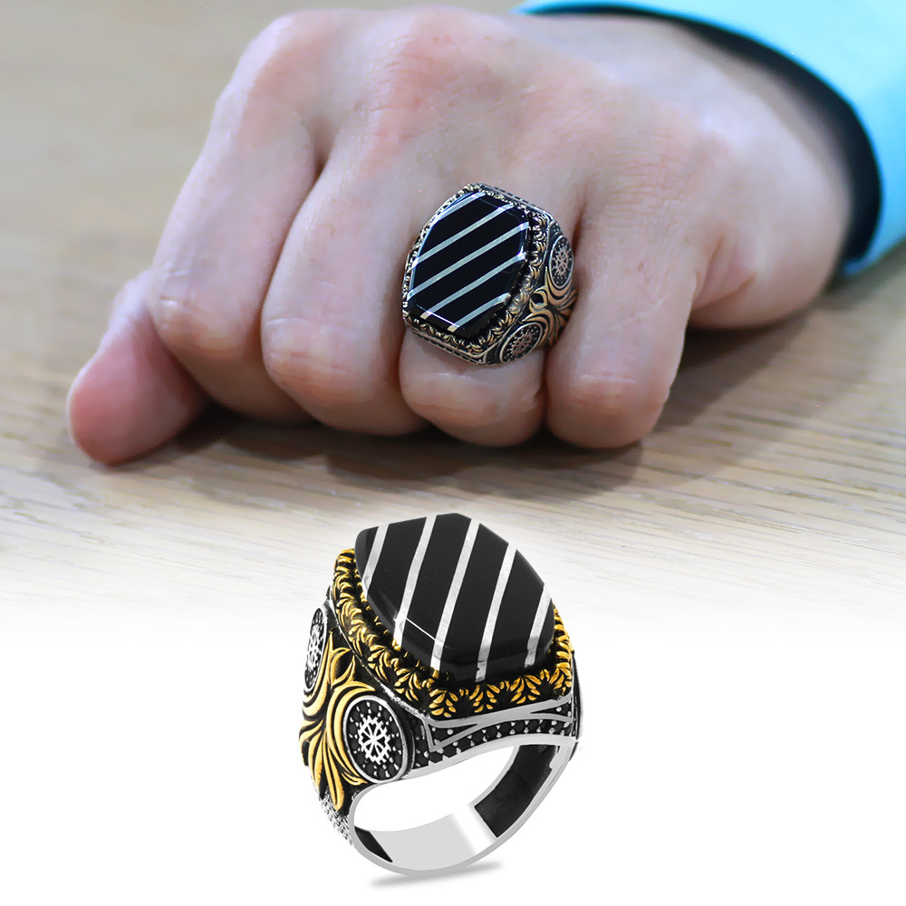 Erzurum Oltu Taşı Üzeri Gümüş Çapraz Şerit İşlemeli Koleksiyonluk 925 Ayar Gümüş Erkek Yüzük