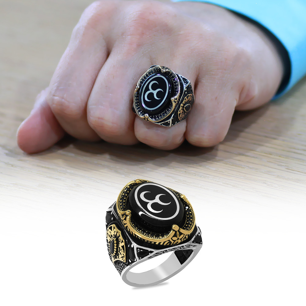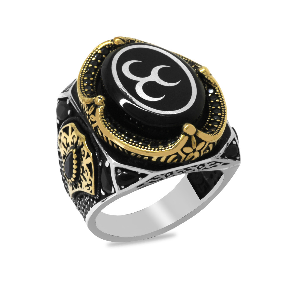 Erzurum Oltu Taşı Üzerine Üç Hilal İşleme Kenarları Zirkon Koleksiyonluk 925 Ayar Gümüş Erkek Yüzük