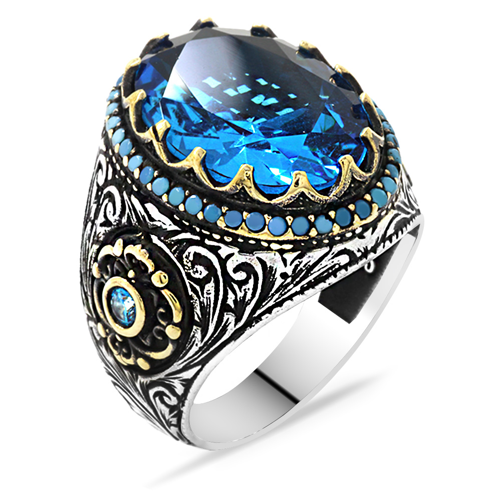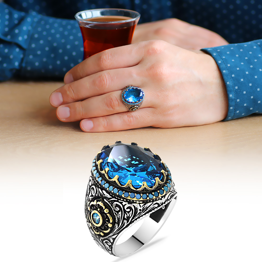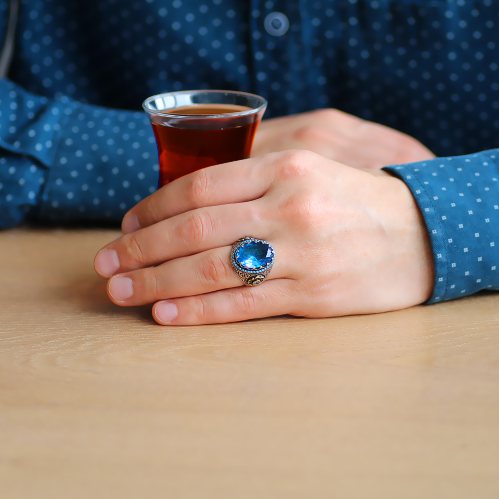 Faset Kesim Aqua Mavi Zirkon Taşlı 925 Ayar Gümüş Erkek Yüzük
