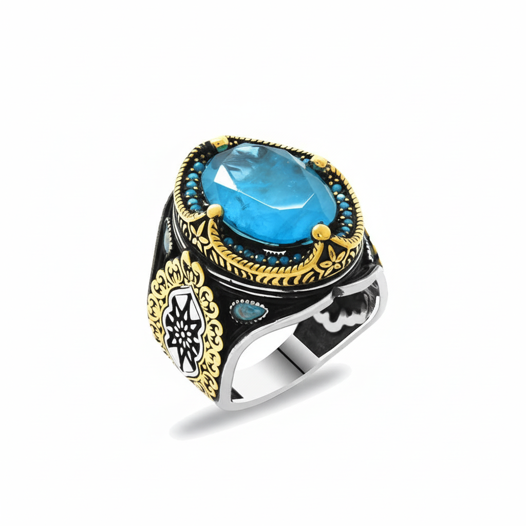 Faset Kesim Aqua Paraiba Taşlı 925 Ayar Gümüş Erkek Yüzük