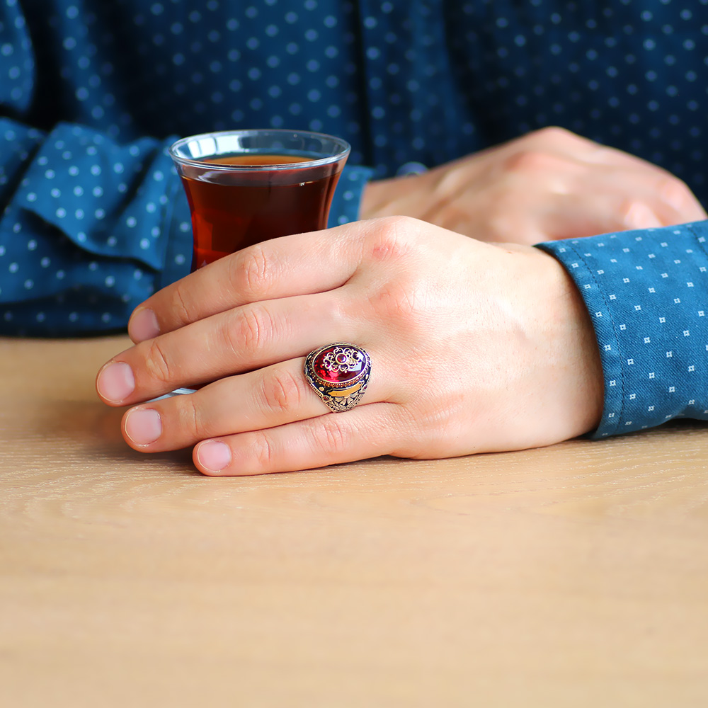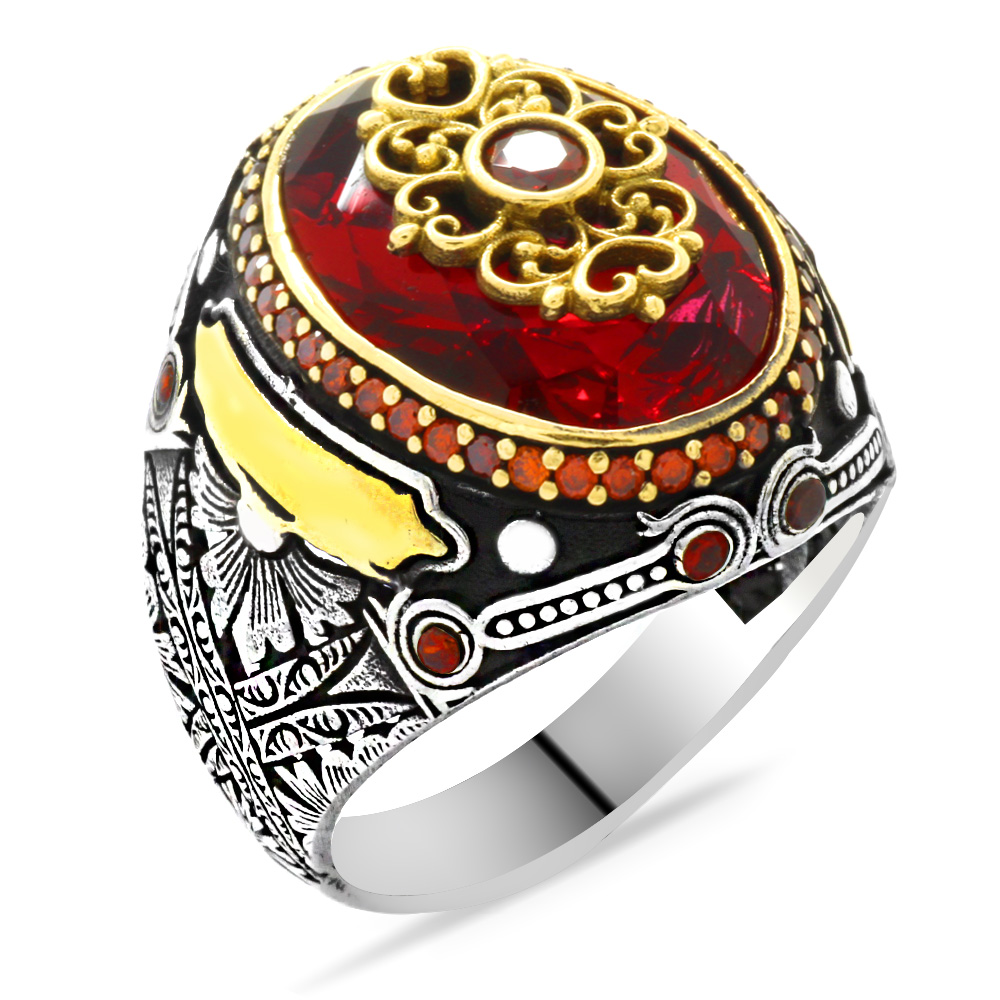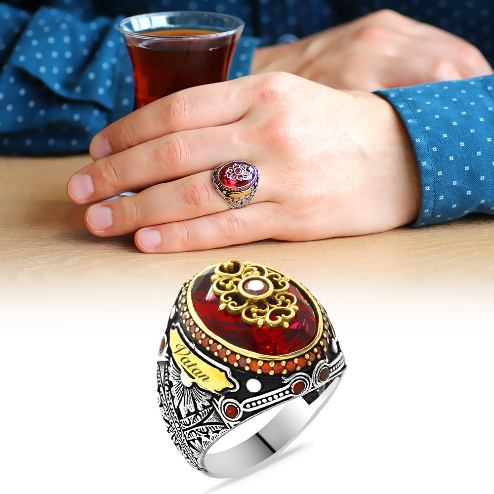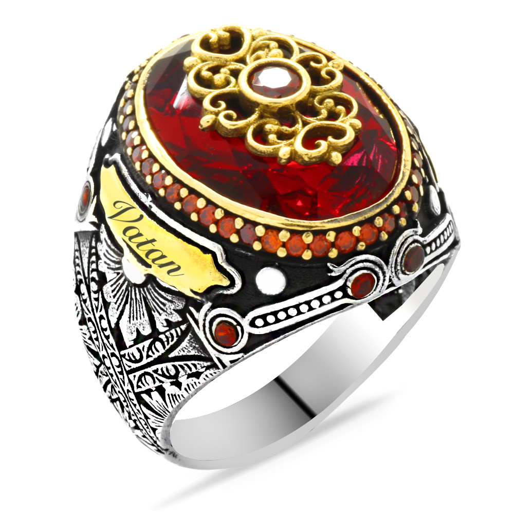 Faset Kesim Kırmızı Zirkon Taşlı Kişiye Özel İsim Yazılı 925 Ayar Gümüş Erkek Yüzük
