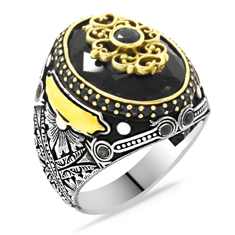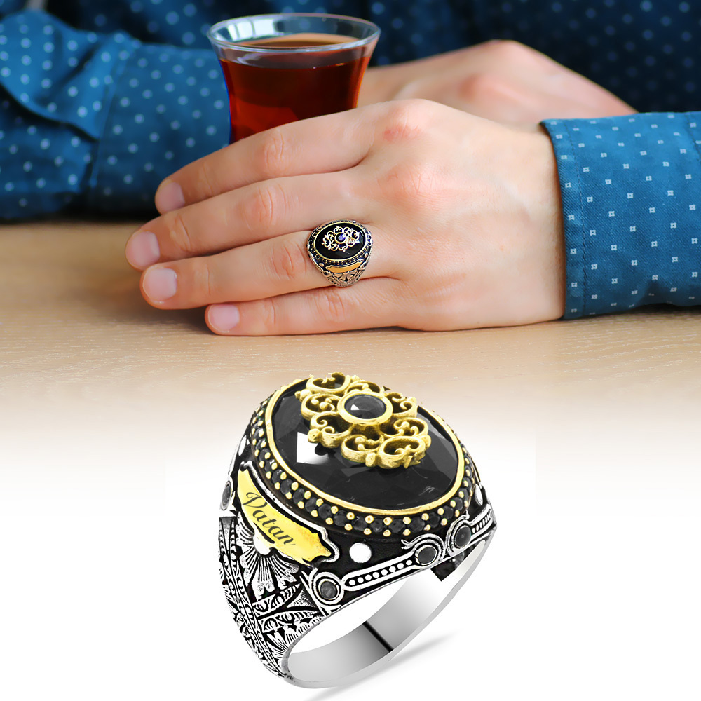 Faset Kesim Siyah Zirkon Taşlı İsme Özel Yazılı 925 Ayar Gümüş Erkek Yüzük