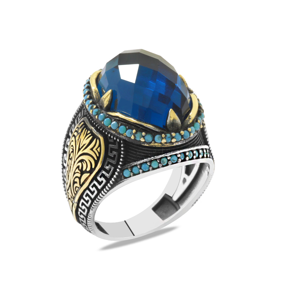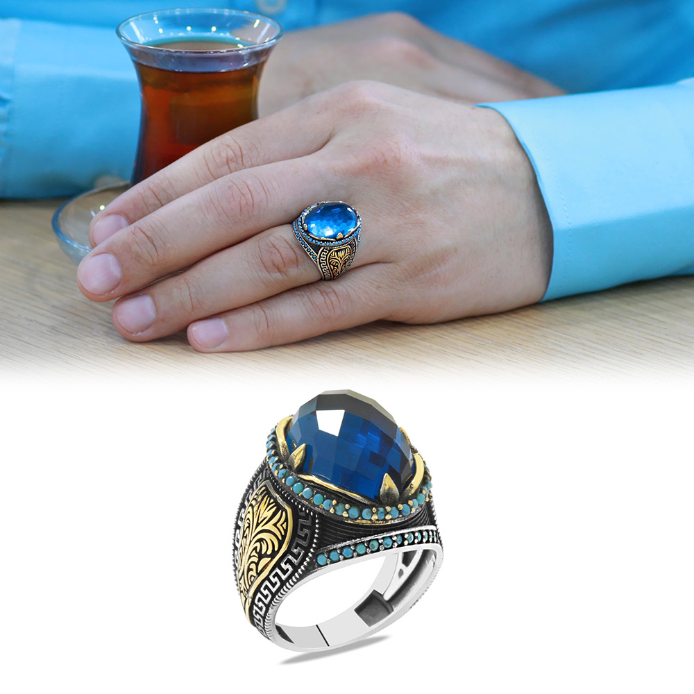 Faset Kesim Turkuaz Zirkon Taşlı Oval Tasarım Grek Süslemeli 925 Ayar Gümüş Erkek Yüzük