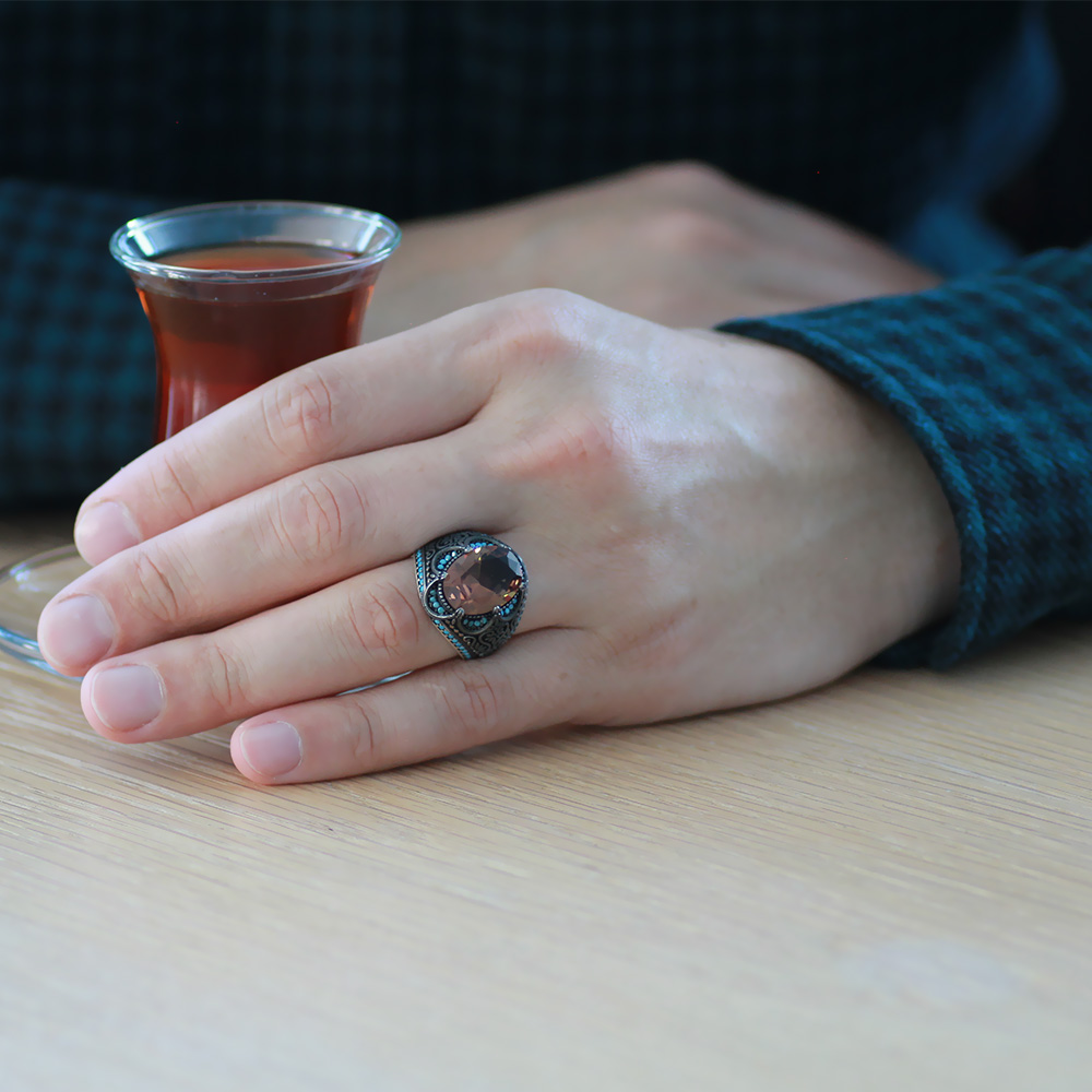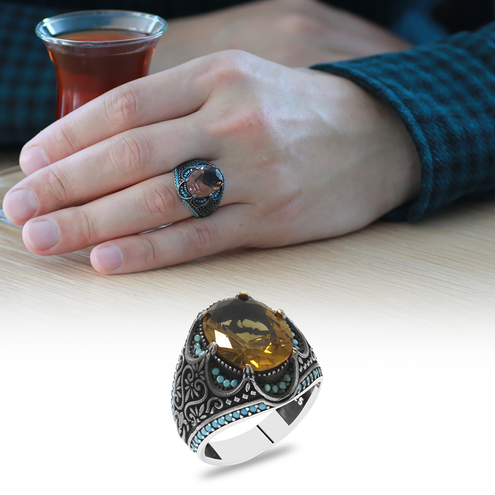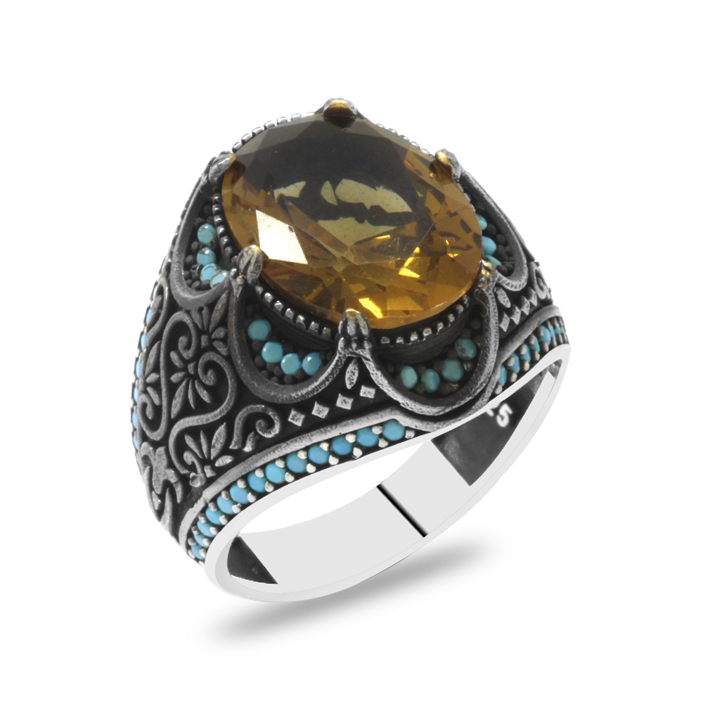 Faset Kesim Zultanit Taşlı Yanları Firuze Taş Mıhlamalı Kral Tacı Tasarım 925 Ayar Gümüş Erkek Yüzük