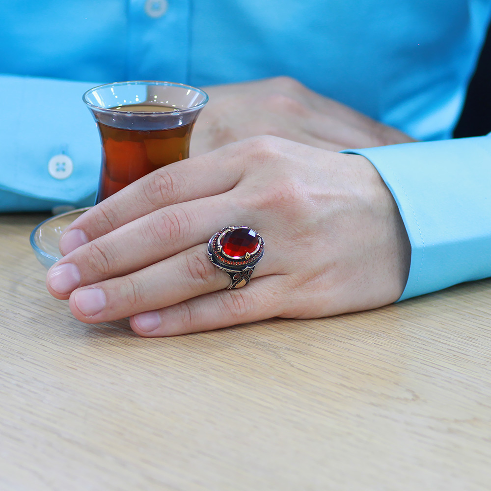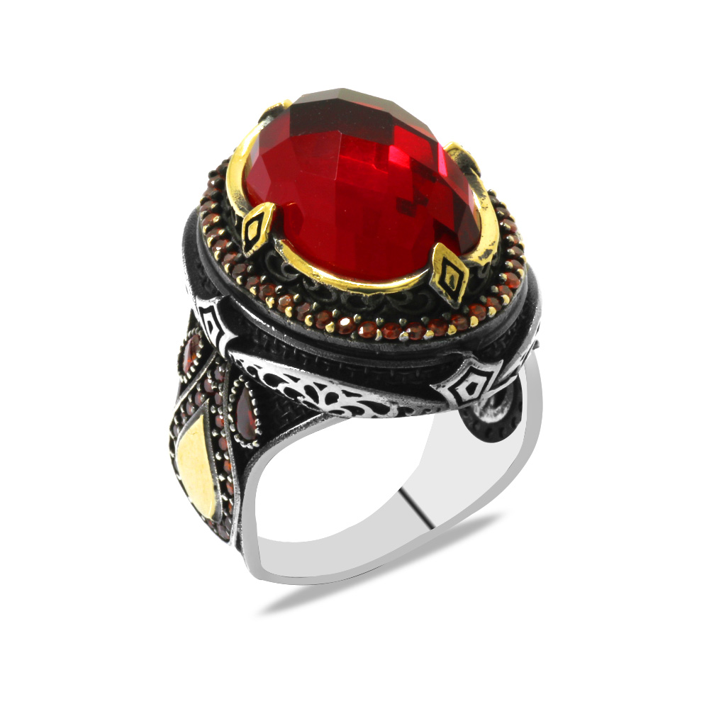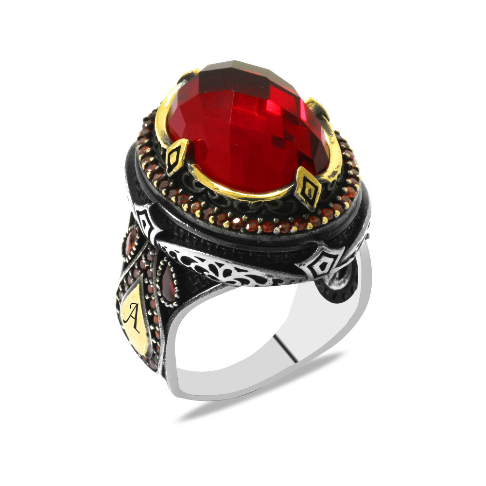 Faset Kırmızı Zirkon Taşlı Kral Tacı Tasarım İsme Özel Yazılı 925 Ayar Gümüş Erkek Yüzük
