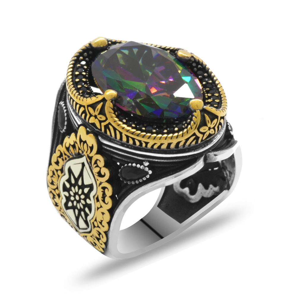 Faset Mistik Taşlı Kral Tacı Tasarım 925 Ayar Gümüş Erkek Yüzük