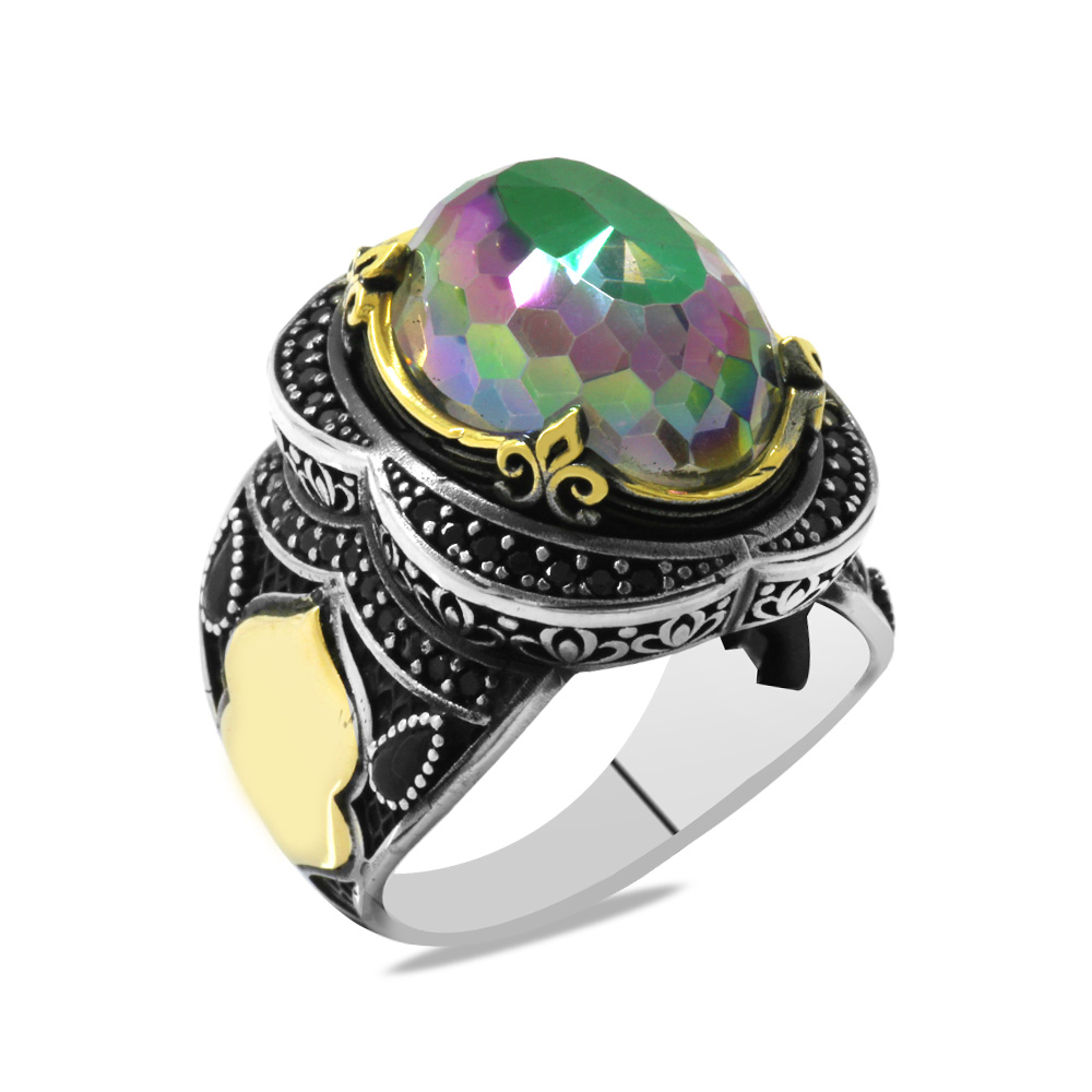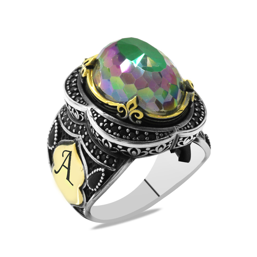 Faset Mistik Topaz Taşlı Oval Tasarım İsme Özel Yazılı 925 Ayar Gümüş Erkek Yüzük