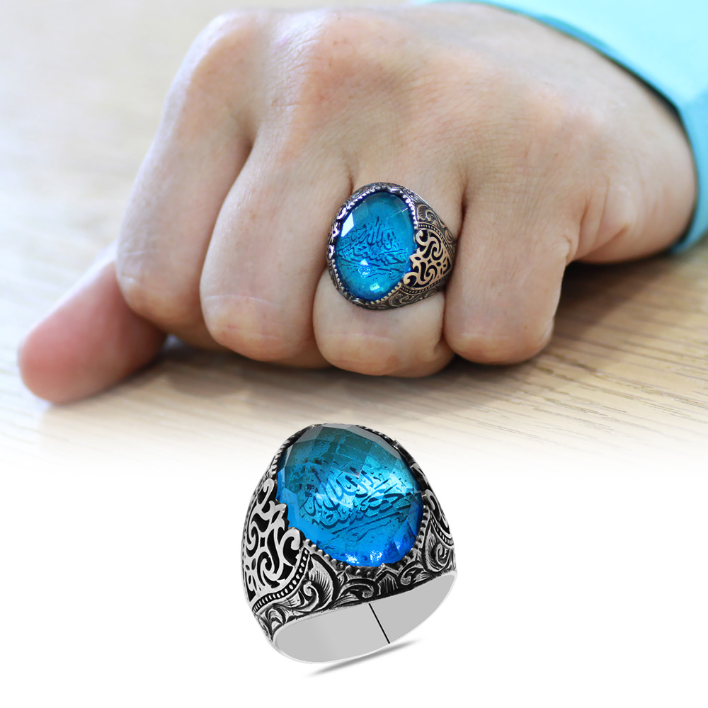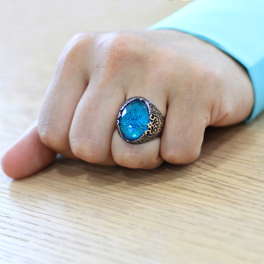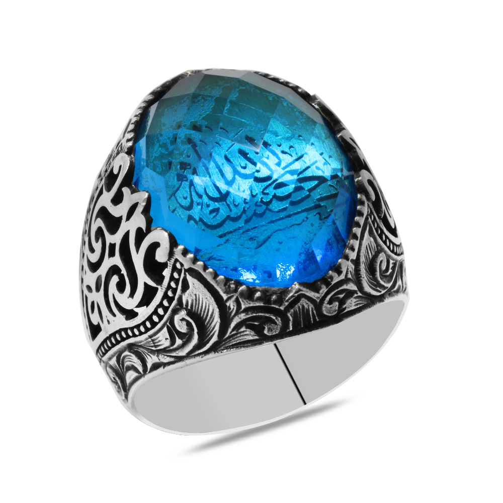 Faset Turkuaz Zirkon Taşlı Hüsnü Hat Hasbünallah Yazılı 925 Ayar Gümüş Erkek Yüzük