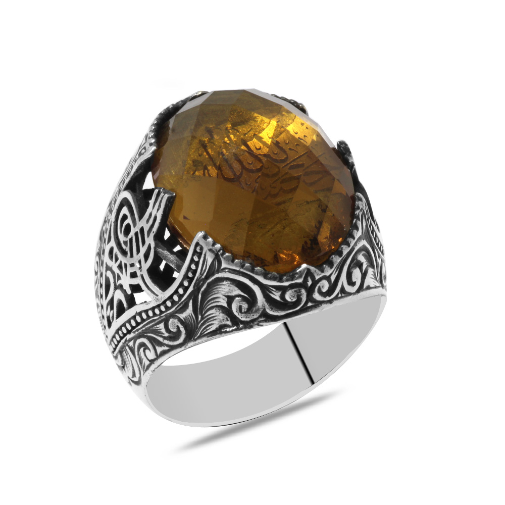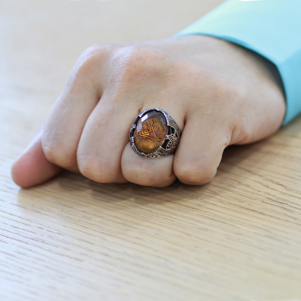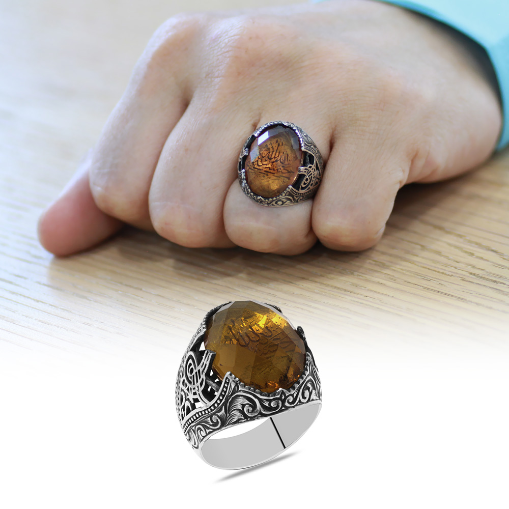 Faset Zultanit Taşlı Hüsnü Hat Hasbünallah Yazılı 925 Ayar Gümüş Erkek Yüzük