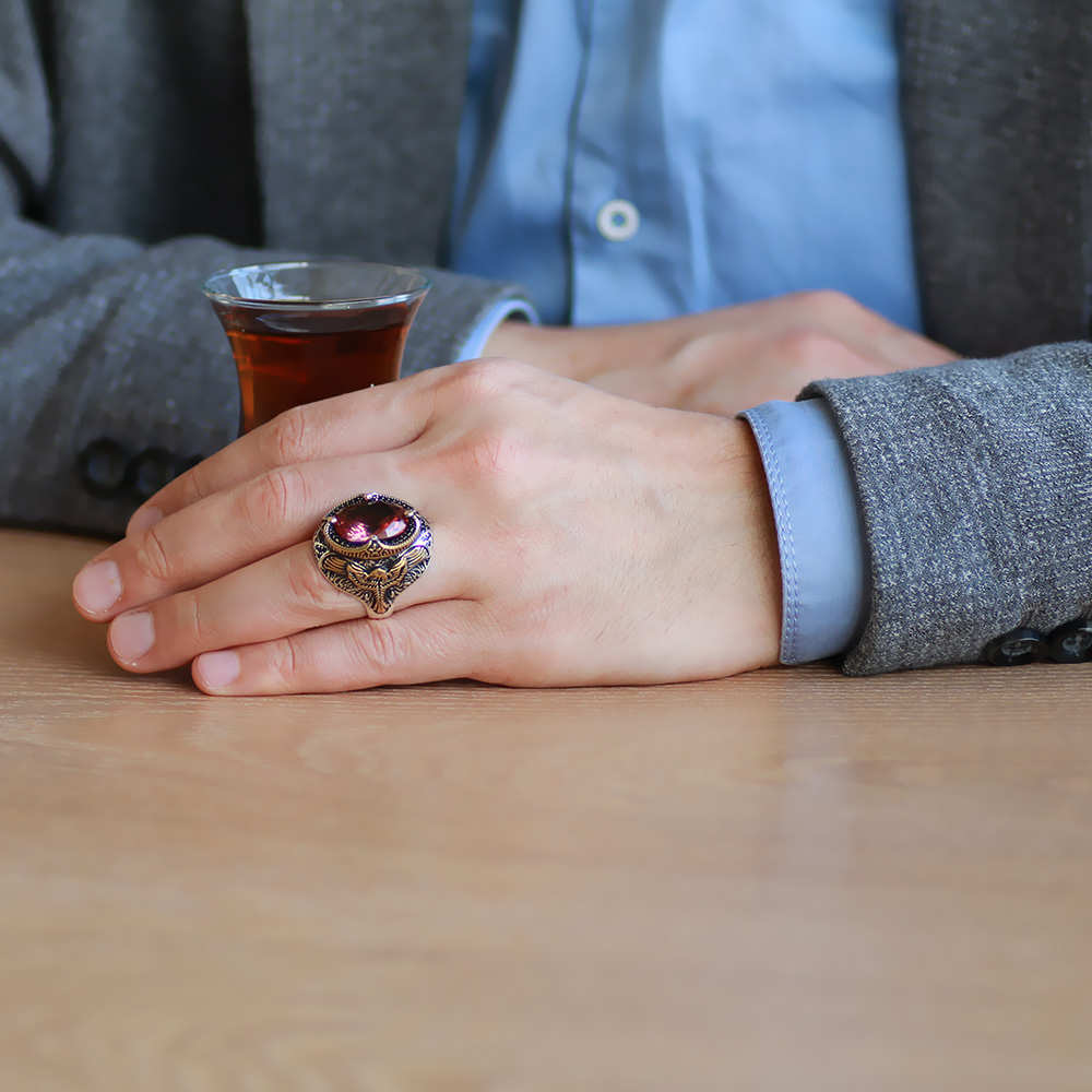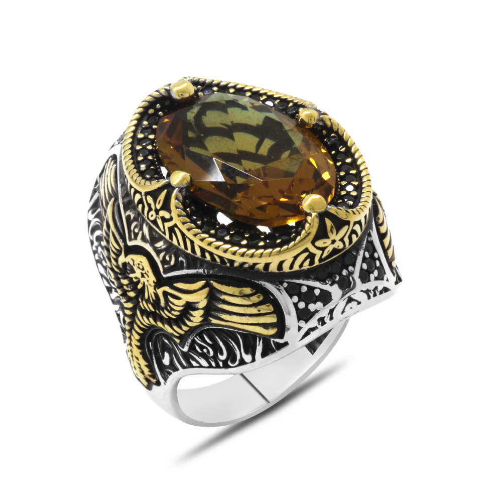 Faset Zultanit Taşlı Kartal Kanadı Detaylı Agresif Kasa Tasarımlı 925 Ayar Gümüş Erkek Yüzük