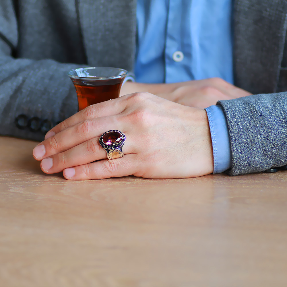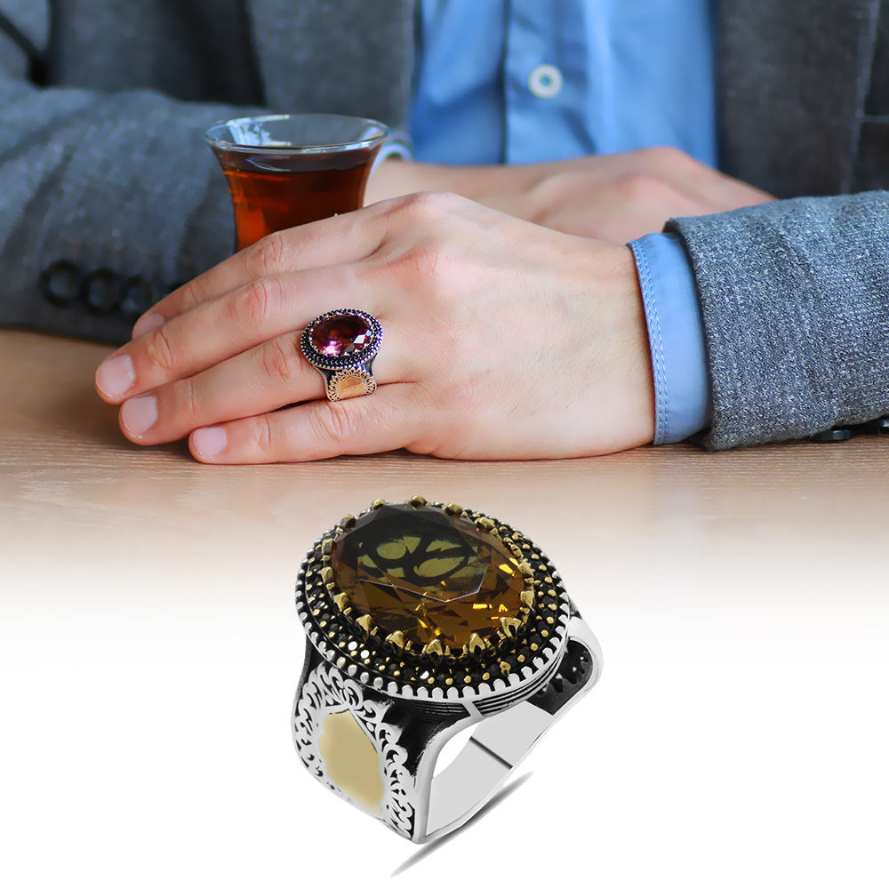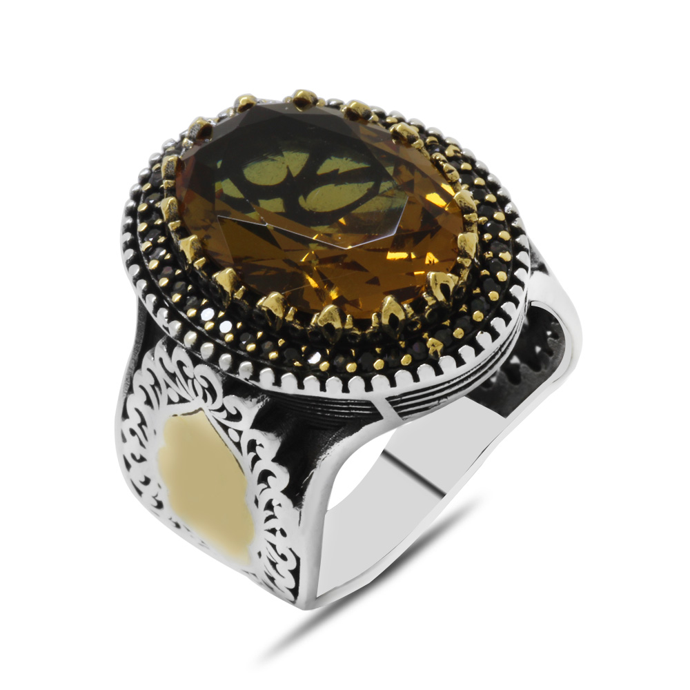 Faset Zultanit Taşlı Yanları Mikro Taş Mıhlamalı 925 Ayar Gümüş Erkek Yüzük