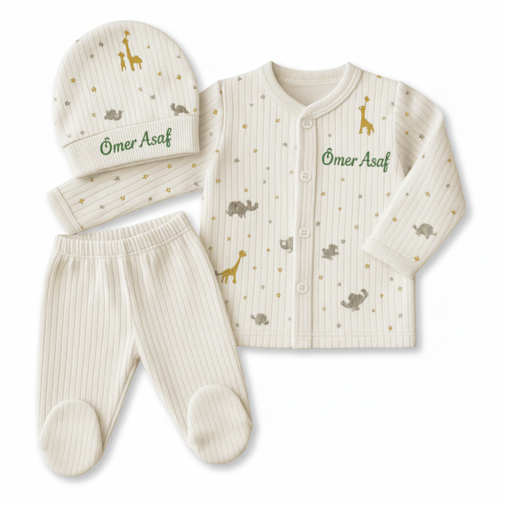 Fil ve zürafa baskılı, kişiye özel isim nakışlı bu beyaz 3’lü set; alt, üst ve şapka parçalarıyla 0-3 aylık bebekler için ideal bir tercihtir. %100 pamuk penye kumaştan üretilen takım, yumuşacık dokusuyla bebeğinizin cildine hassas temas sunar. Sevimli hayvan figürleriyle süslenen tasarımı ve kişiselleştirilebilir özelliği sayesinde hem günlük kullanımda hem de özel bir hediye olarak öne çıkar. Şıklığı ve fonksiyonelliği bir araya getiren bu set, bebeklerin ilk aylarında hem konforlu hem anlamlı bir seçenek sunar.