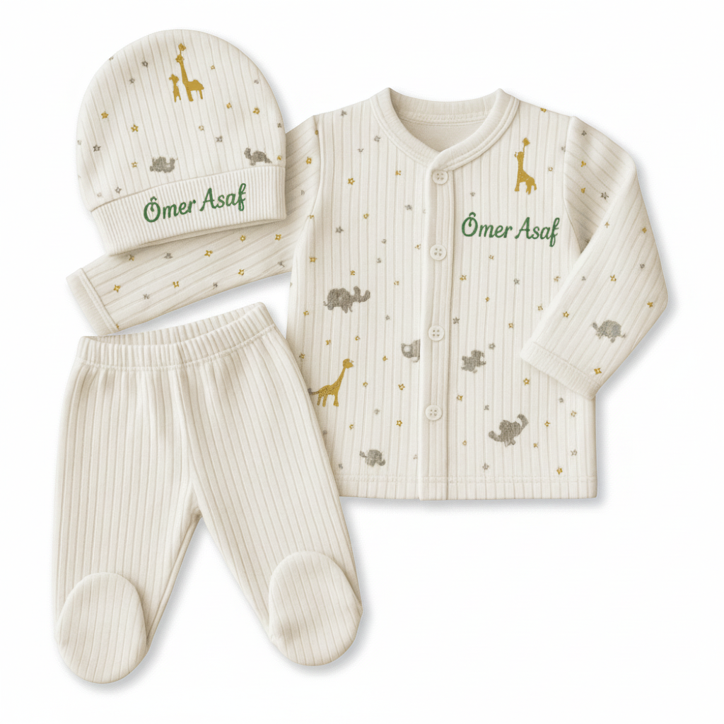 Fil Zürafa Baskılı İsme Özel Nakışlı Beyaz 3 lü Bebek Takımı 3-6 Ay