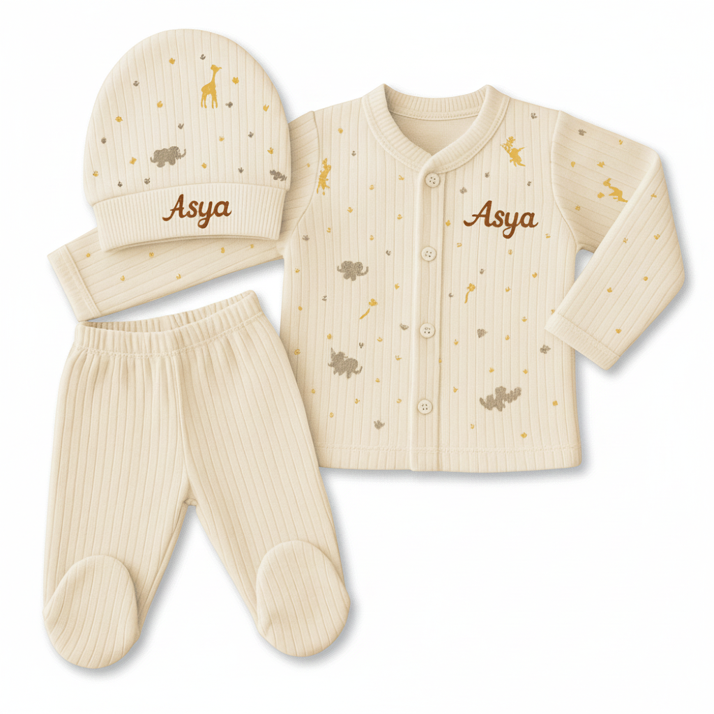 Fil ve zürafa baskılı, kişiye özel isim nakışlı bu krem 3’lü set; alt, üst ve şapka parçalarıyla 3-6 aylık bebekler için ideal bir tercihtir. %100 pamuk penye kumaştan üretilen takım, yumuşacık dokusuyla bebeğinizin cildine hassas temas sunar. Sevimli hayvan figürleriyle süslenen tasarımı ve kişiselleştirilebilir özelliği sayesinde hem günlük kullanımda hem de özel bir hediye olarak öne çıkar. Şıklığı ve fonksiyonelliği bir araya getiren bu set, bebeklerin ilk aylarında hem konforlu hem anlamlı bir seçenek sunar.