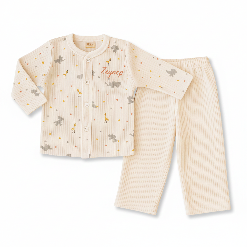 Fil ve zürafa baskılı, kişiye özel isim nakışlı bu pembe 3’lü set; alt, üst ve şapka parçalarıyla 0-3 aylık bebekler için ideal bir tercihtir. %100 pamuk penye kumaştan üretilen takım, yumuşacık dokusuyla bebeğinizin cildine hassas temas sunar. Sevimli hayvan figürleriyle süslenen tasarımı ve kişiselleştirilebilir özelliği sayesinde hem günlük kullanımda hem de özel bir hediye olarak öne çıkar. Şıklığı ve fonksiyonelliği bir araya getiren bu set, bebeklerin ilk aylarında hem konforlu hem anlamlı bir seçenek sunar.