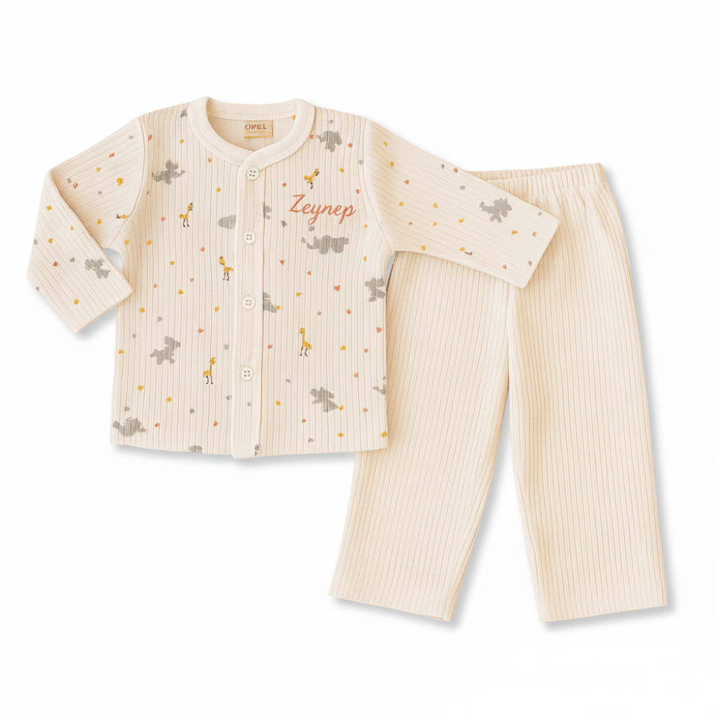 Fil ve zürafa baskılı, kişiye özel isim nakışlı bu pembe 3’lü set; alt, üst ve şapka parçalarıyla 9-12 aylık bebekler için ideal bir tercihtir. %100 pamuk penye kumaştan üretilen takım, yumuşacık dokusuyla bebeğinizin cildine hassas temas sunar. Sevimli hayvan figürleriyle süslenen tasarımı ve kişiselleştirilebilir özelliği sayesinde hem günlük kullanımda hem de özel bir hediye olarak öne çıkar. Şıklığı ve fonksiyonelliği bir araya getiren bu set, bebeklerin ilk aylarında hem konforlu hem anlamlı bir seçenek sunar.