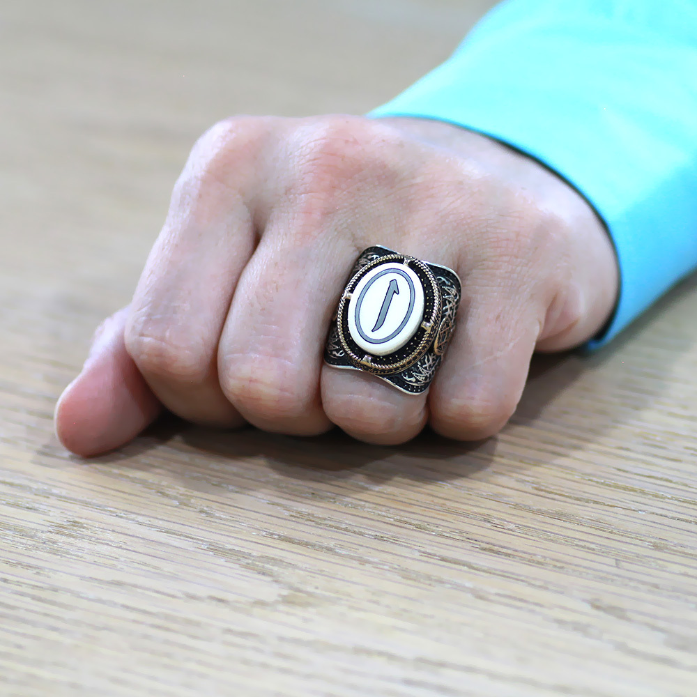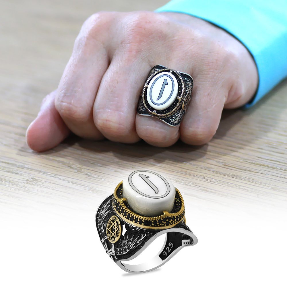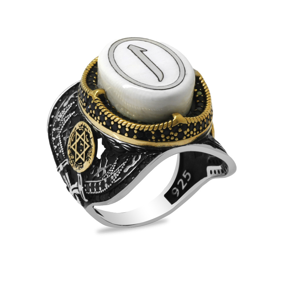 Fildişi Üzerine Arapça Elif İşlemeli Kenarları Zirkon Taşlı Koleksiyonluk 925 Ayar Gümüş Erkek Yüzük