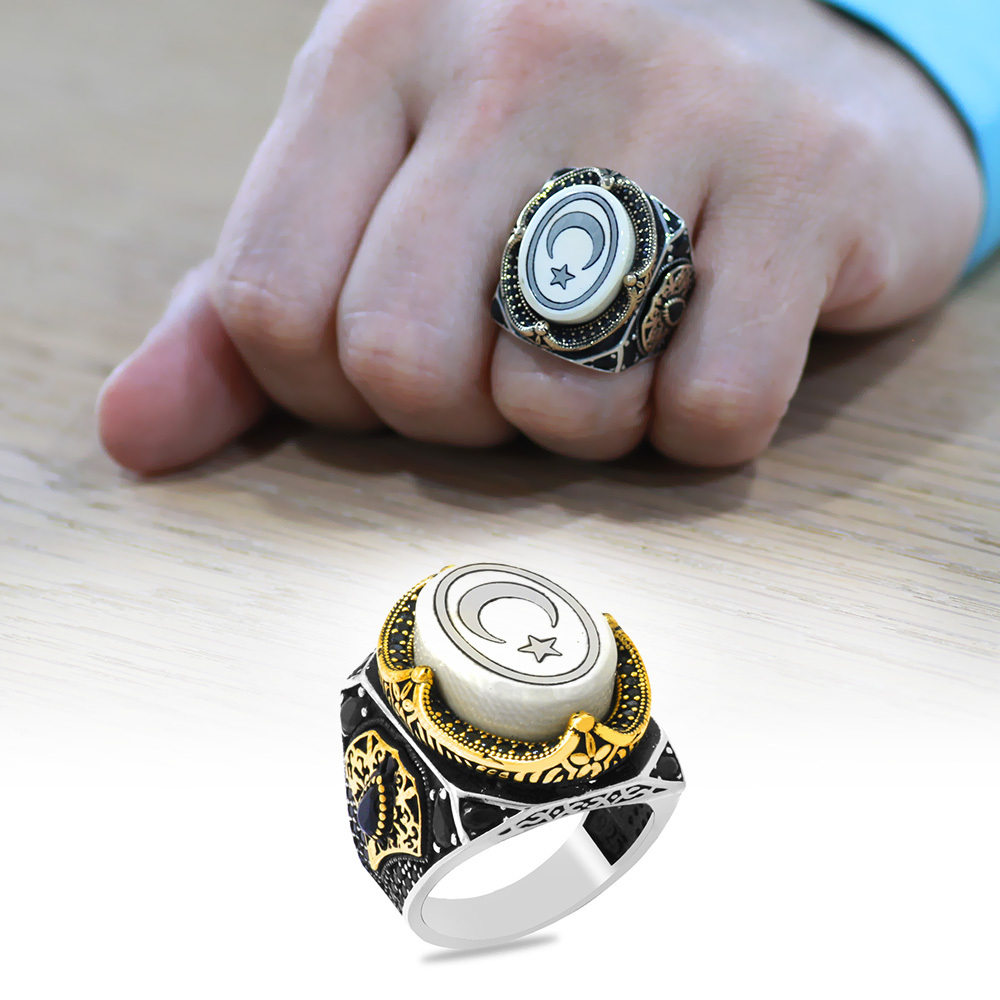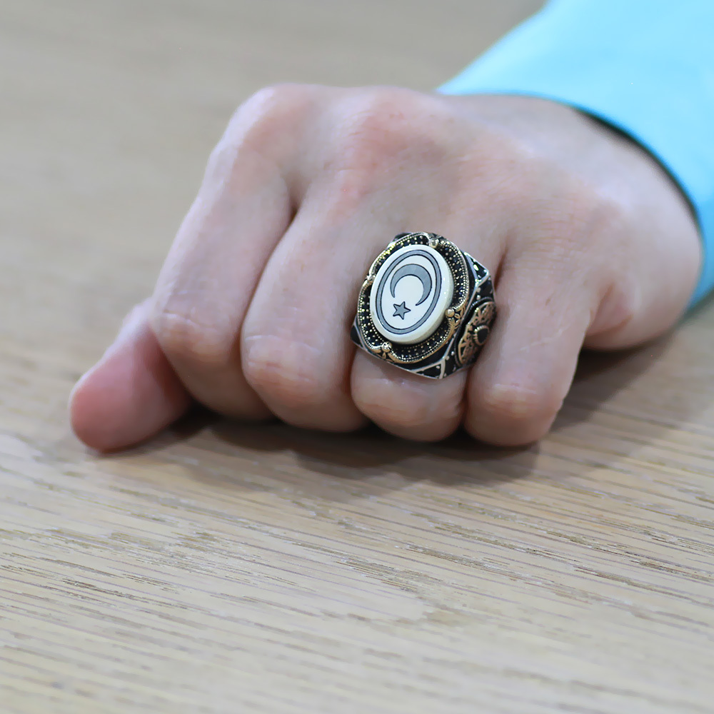 Fildişi Üzerine Ayyıldız İşlemeli Kenarları Zirkon Taşlı Koleksiyonluk 925 Ayar Gümüş Erkek Yüzük