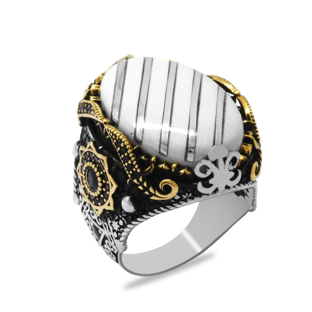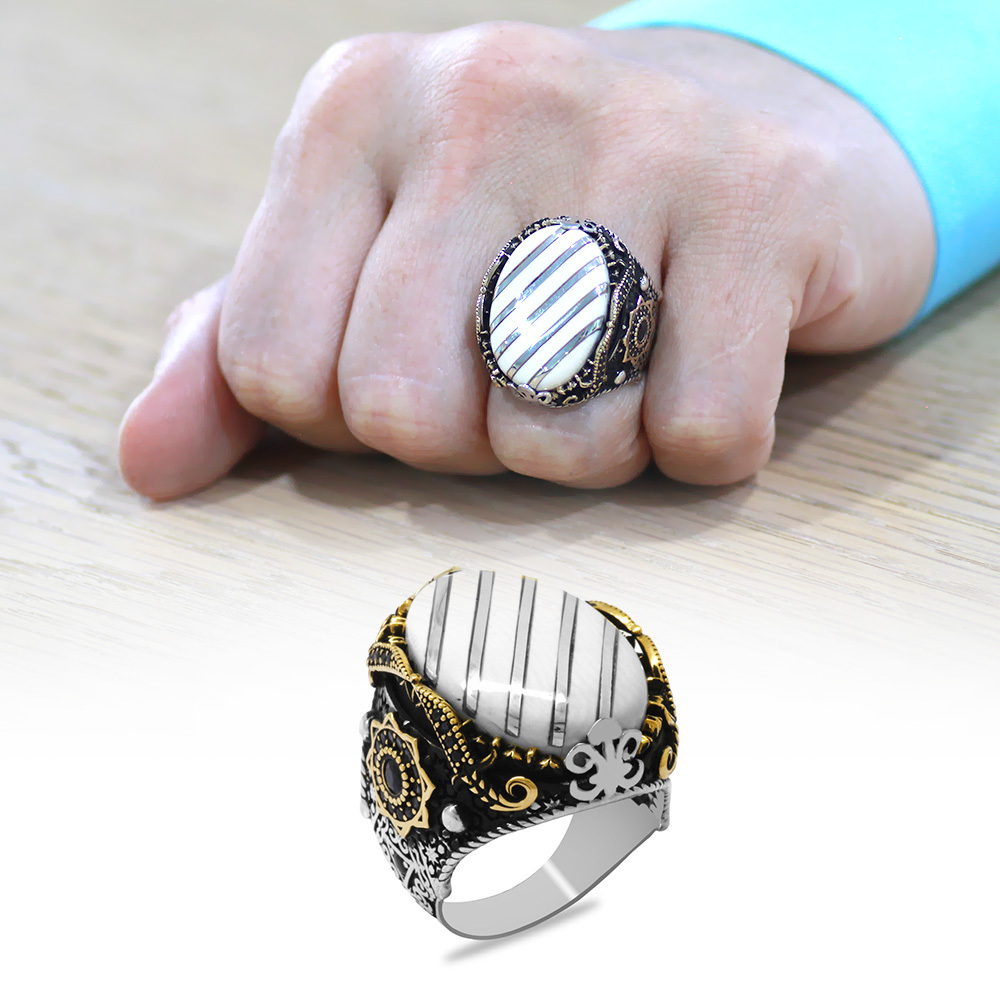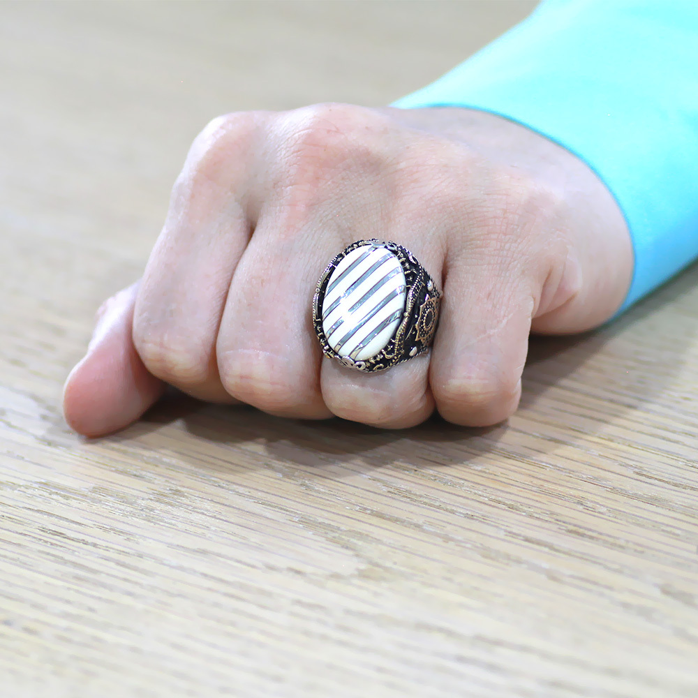 Fildişi Üzerine Gümüş Çapraz Şerit İşlemeli Oval Tasarım Koleksiyonluk 925 Ayar Gümüş Erkek Yüzük