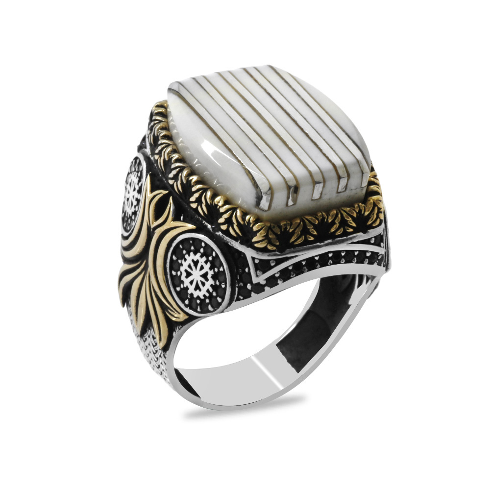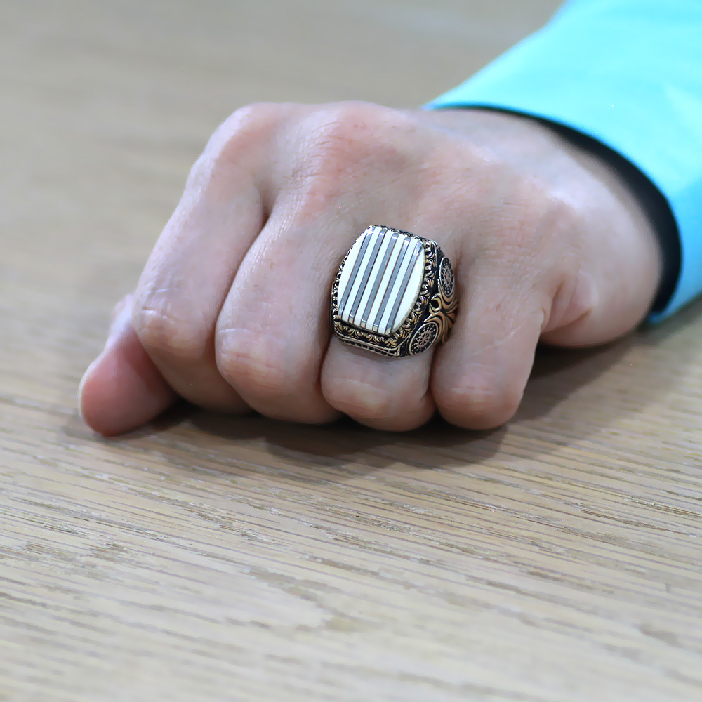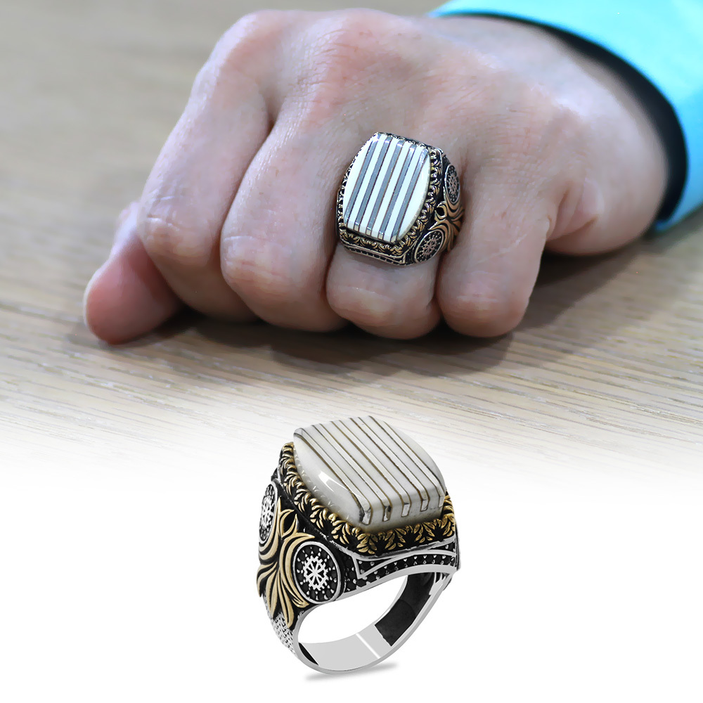 Fildişi Üzerine Gümüş Dikey Şerit İşlemeli Zirkon Taşlı Koleksiyonluk 925 Ayar Gümüş Erkek Yüzük