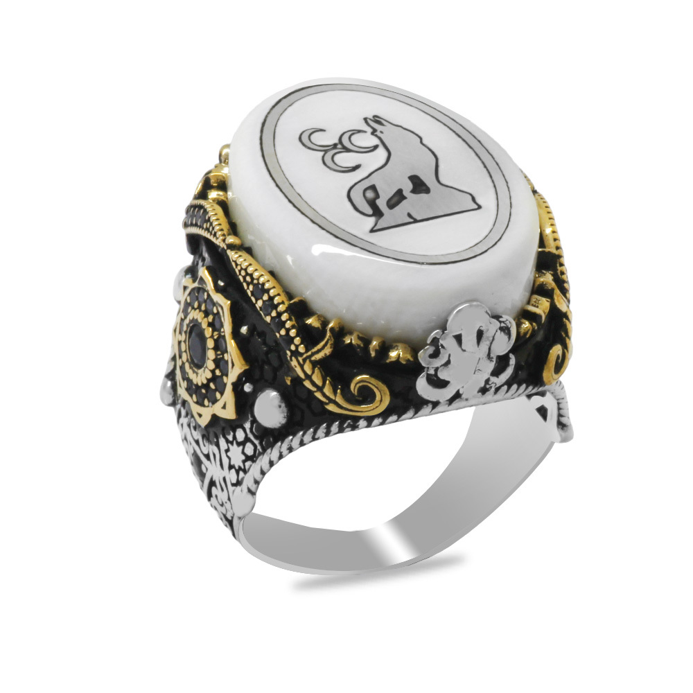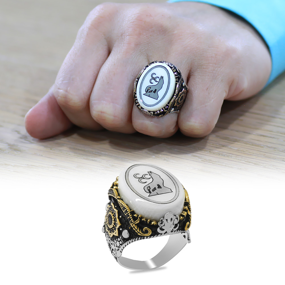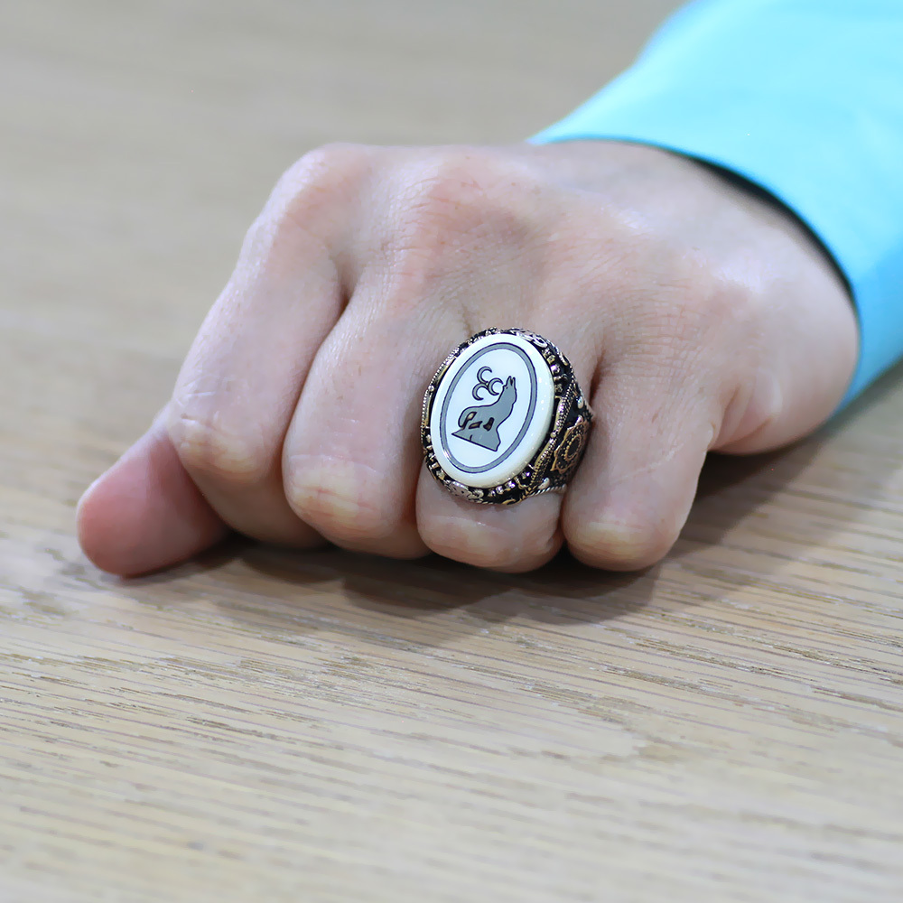 Fildişi Üzerine Üç Hilal Kurt İşlemeli Oval Tasarım Koleksiyonluk 925 Ayar Gümüş Erkek Yüzük