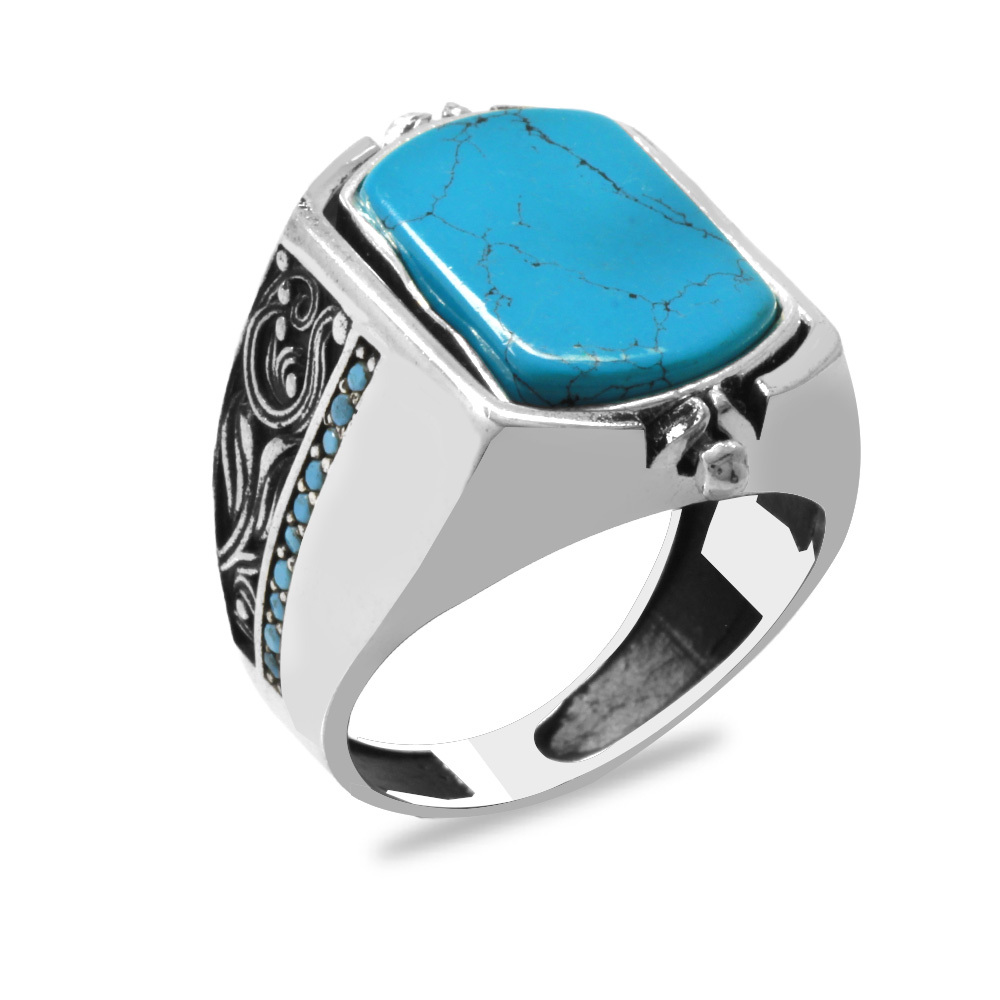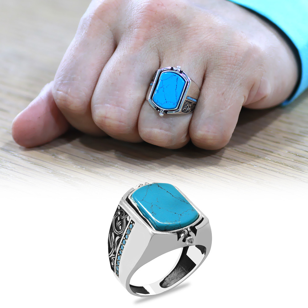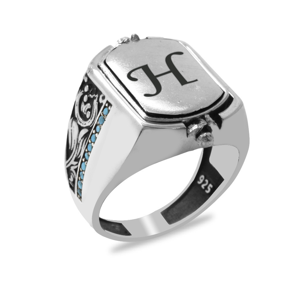 Firuze Taşlı Mikro Taş Mıhlamalı Çift Taraflı İsme Özel Harf Yazılı 925 Ayar Gümüş Erkek Yüzük