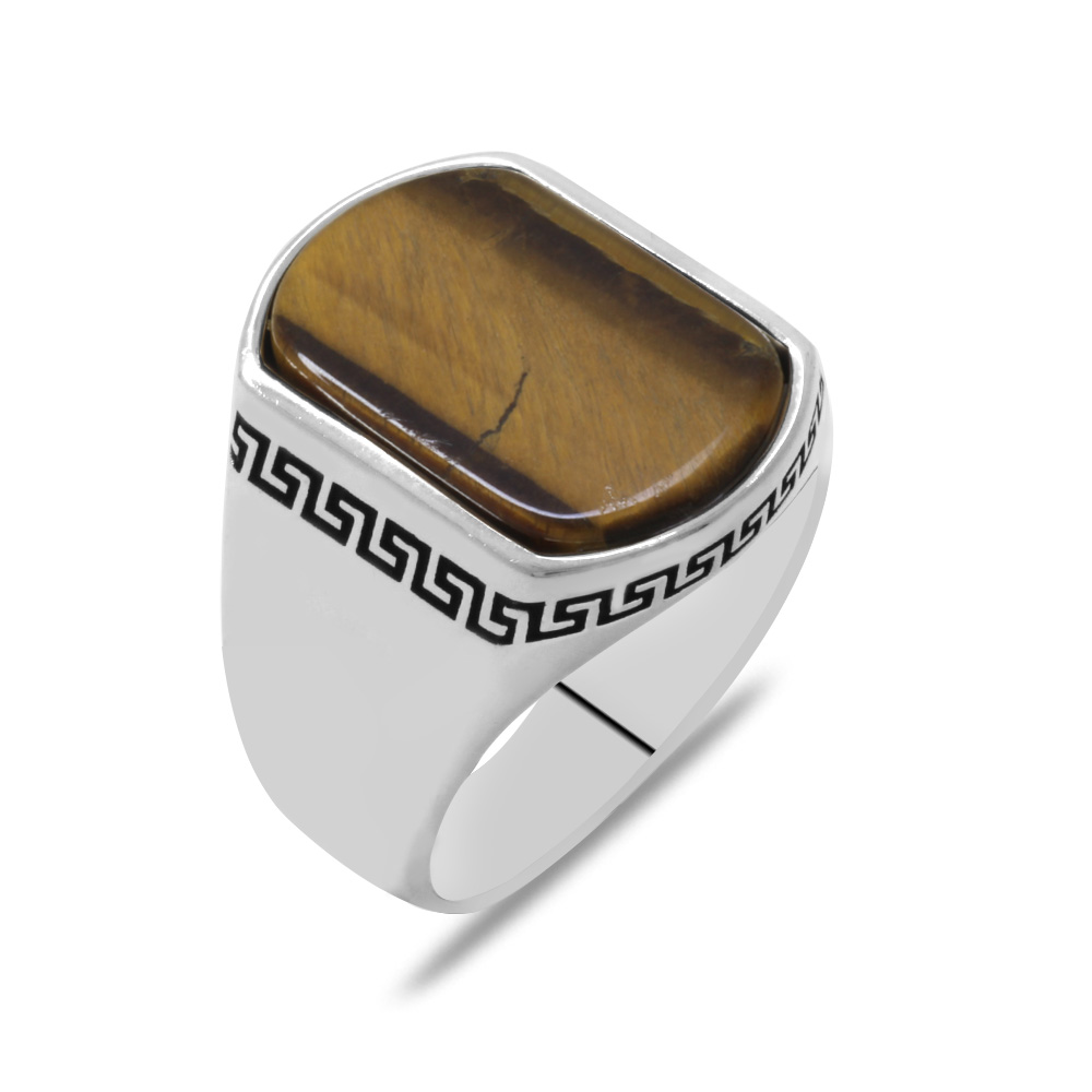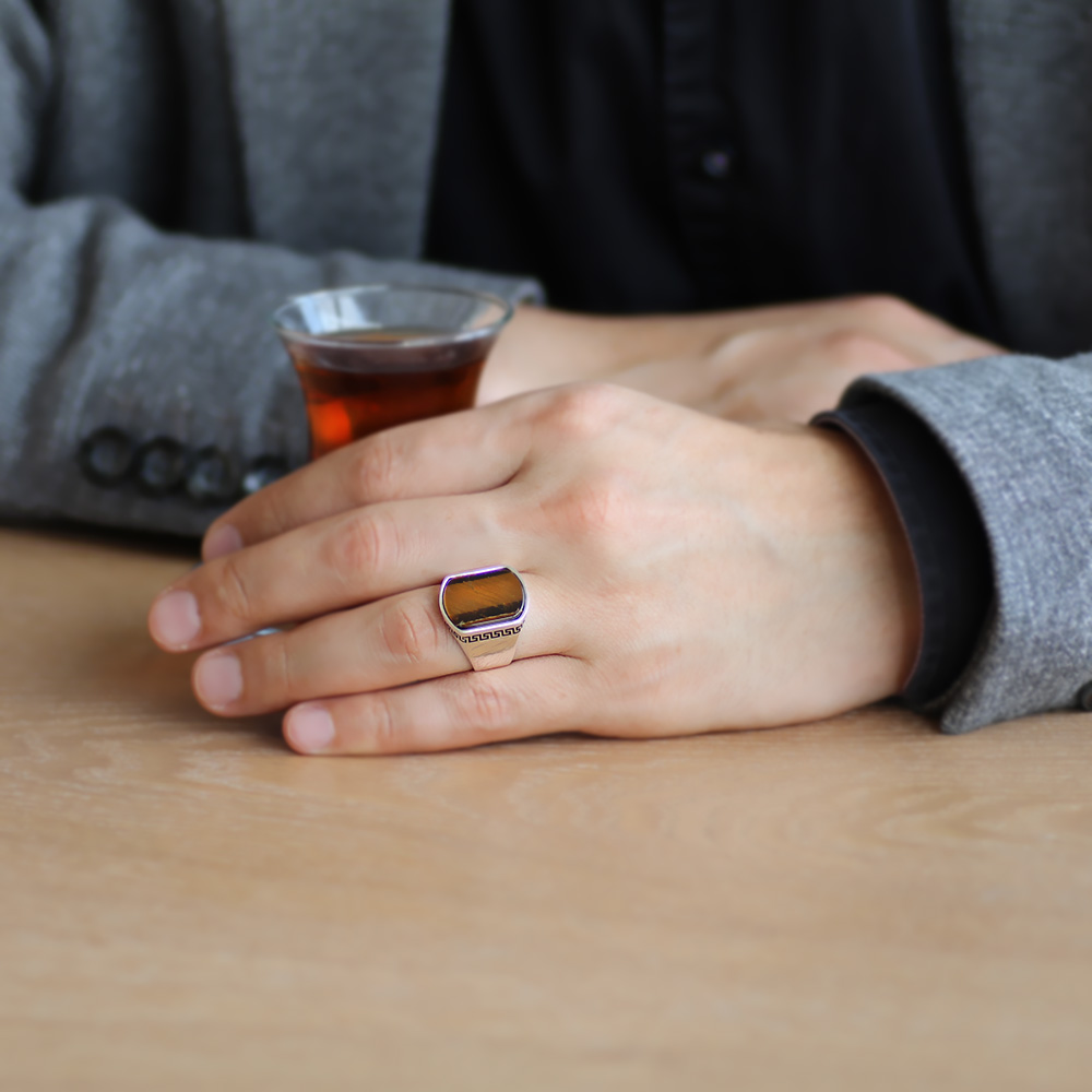 Flat Tasarım Kaplan Gözü Taşlı 925 Ayar Gümüş Erkek Yüzük