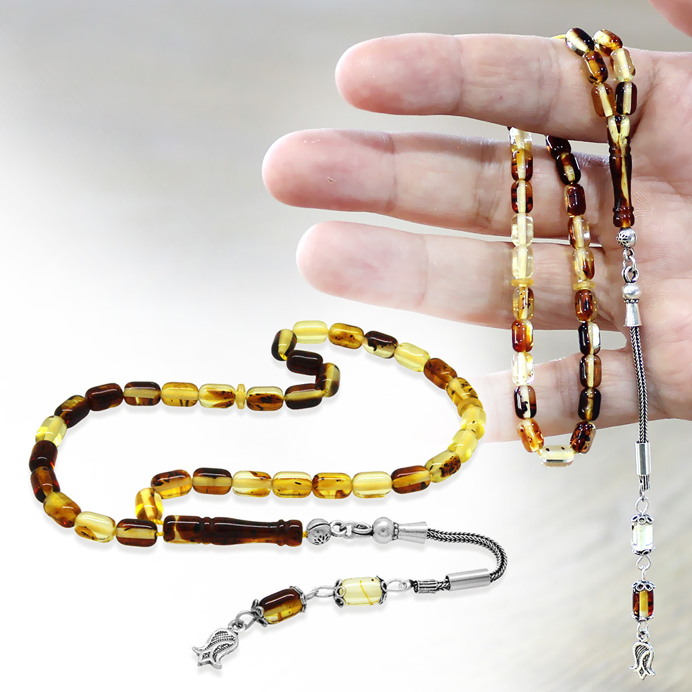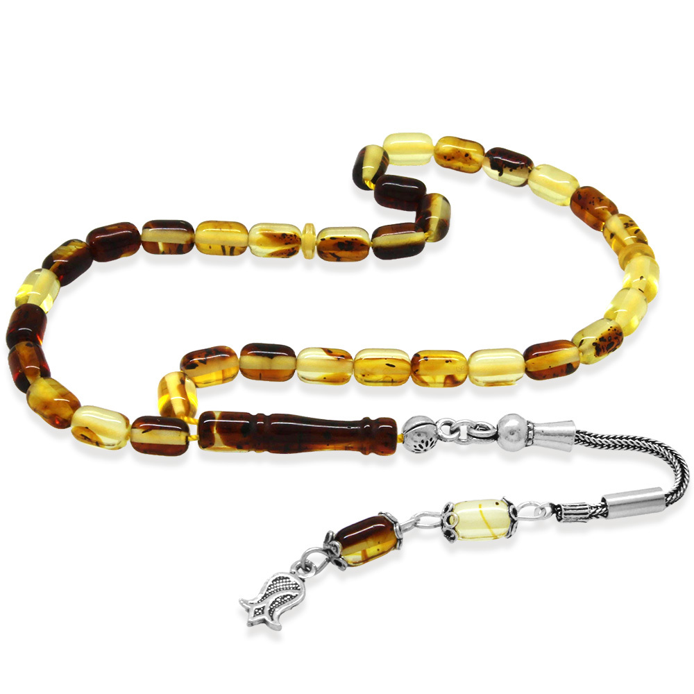 Fosilli Beyrut Kehribar Tesbih - 925 Ayar Gümüş Püsküllü - Mini Boy - Sarı Siyah - Kapsül Kesim