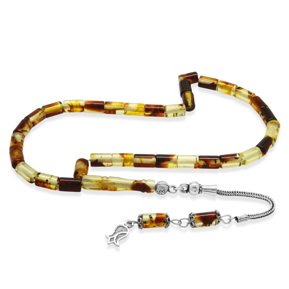 Fosilli Beyrut Kehribar Tesbih - 925 Ayar Gümüş Püsküllü - Mini Boy - Sarı Siyah - Kesme Kesim