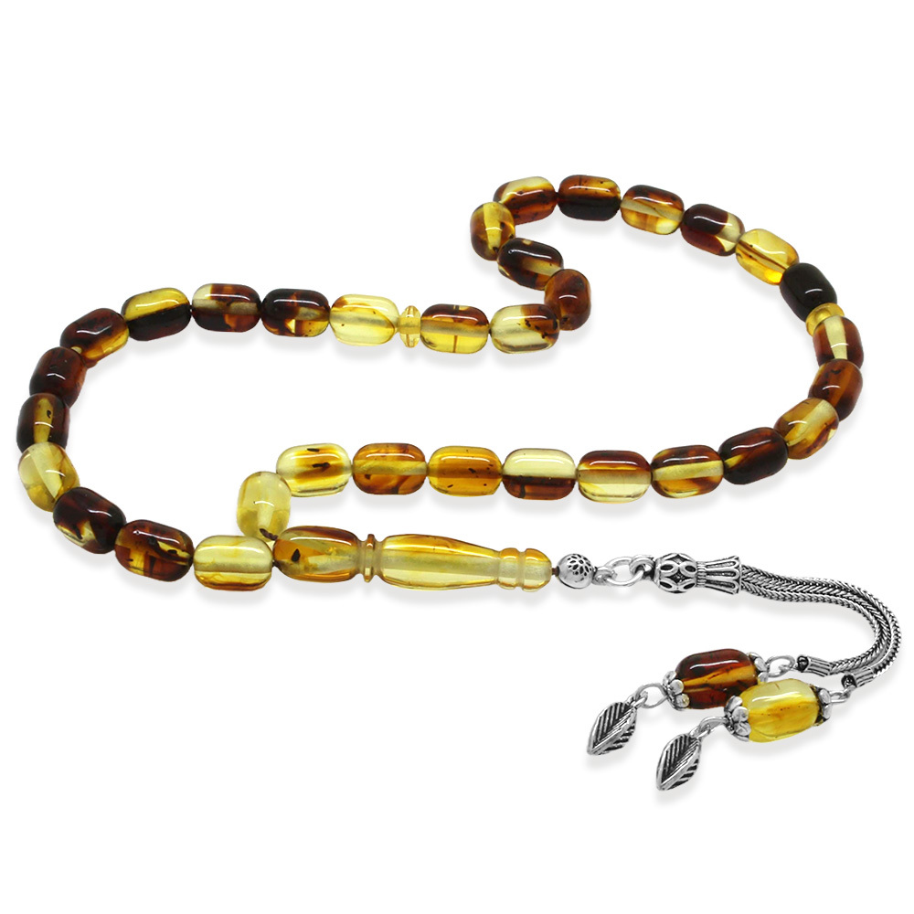 Fosilli Beyrut Kehribar Tesbih - 925 Ayar Gümüş Püsküllü - Sarı Siyah - Kapsül Kesim