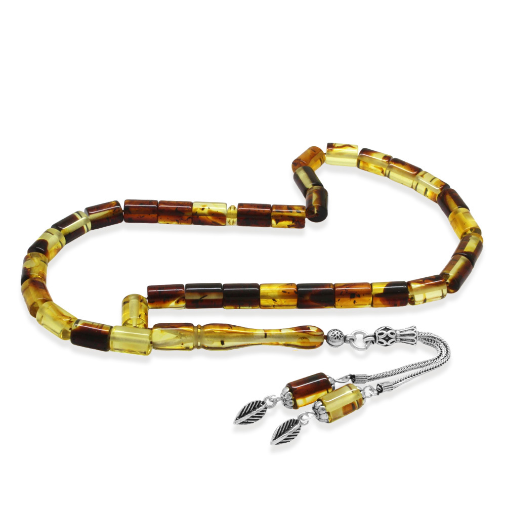 Fosilli Beyrut Kehribar Tesbih - 925 Ayar Gümüş Püsküllü - Sarı Siyah - Kesme Kesim