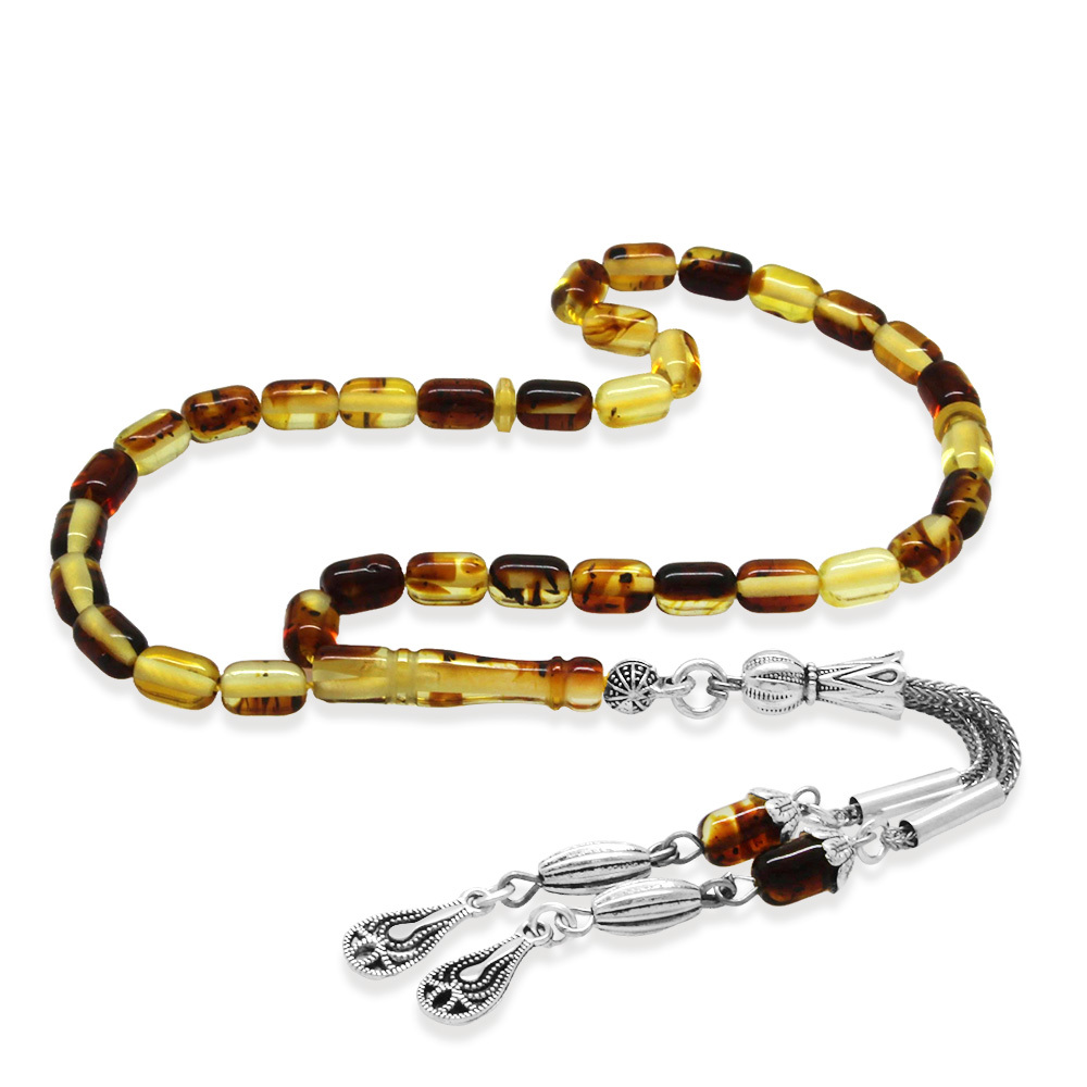 Fosilli Beyrut Kehribar Tesbih - Kararmaz Metal Püsküllü - Mini Boy - Sarı Siyah - Kapsül Kesim